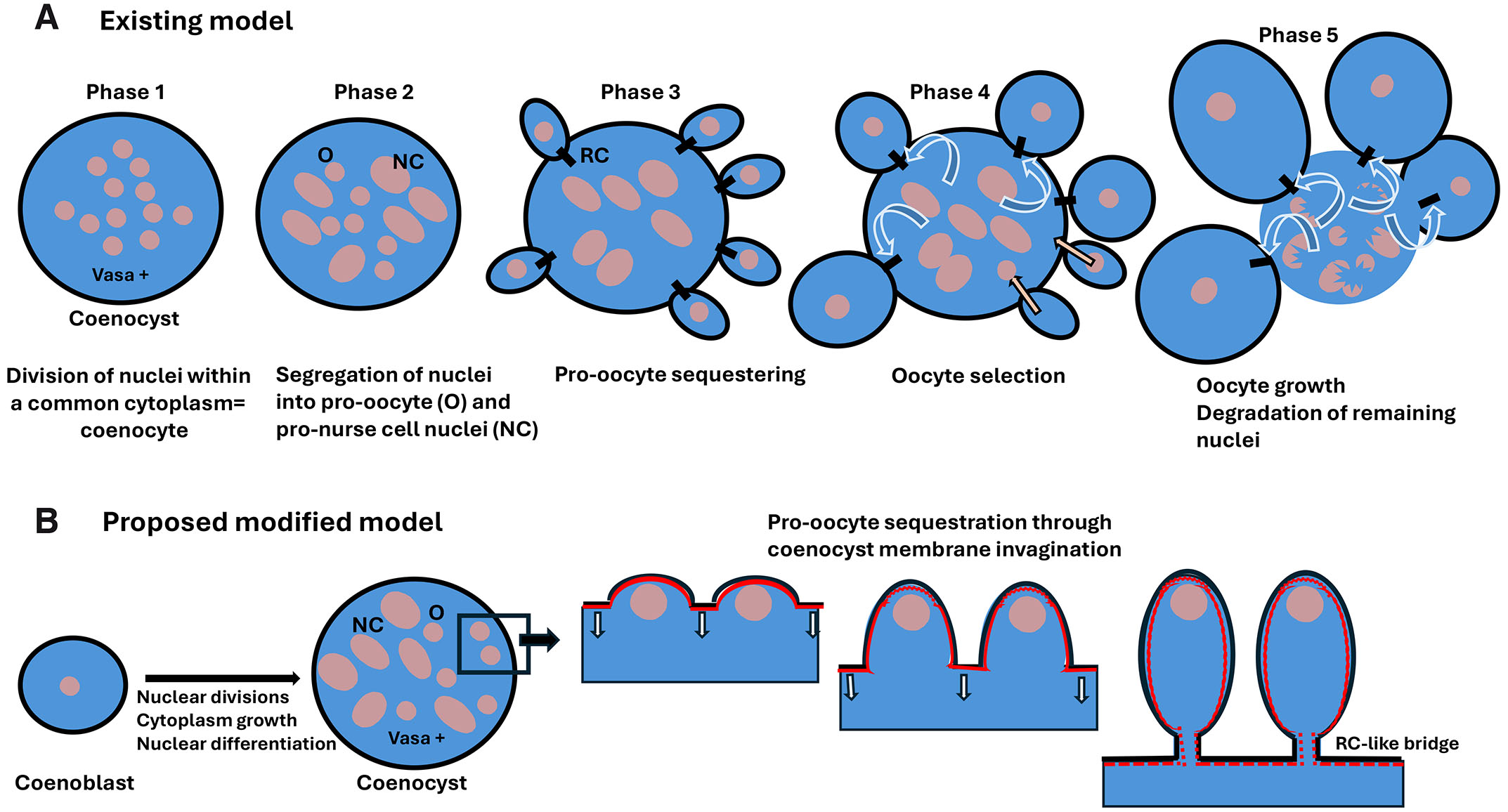 (A) Existing model of appendicularian oogenesis according to Ganot et al. (2007a, 2007b). Phase 1. The coenocyst, which is positive for germline marker Vasa protein, contains many nuclei embedded in a common cytoplasm. It originates from nuclear divisions without cytokinesis. Phase 2. Nuclei segregate and differentiate into two distinct subpopulations: smaller pro-oocyte nuclei and larger (endoreplicating) pro-nurse cell nuclei. Phase 3. Pro-oocytes become separated from the common cytoplasm but remain connected to it by ring canals (RCs). Phase 4. Some of the pro-oocytes are selected as the future oocytes. They grow using nutrients from a common cytoplasm and become the oocytes, while the nuclei of non-selected pro-oocytes return to the common cytoplasm and eventually, like the pro-nurse nuclei, endoreplicate their DNA. Phase 5. Oocytes connected to the coenocyst by RCs grow further, while the remaining nuclei degrade. (B) Proposed modified model. The coenocyst progenitor (an equivalent of the cystoblast), the coenoblast, undergoes nuclear divisions without cytokinesis, producing a multinuclear coenocyst. After nuclear segregation into pro-oocytes and pro-nurse cell fate, the pro-oocytes become sequestered by the invagination of coenocyst membrane underlined by actin (red) in the process reminiscent of cellularization of coenocytic blastoderm in Drosophila. However, in contrast to the Drosophila blastoderm, the cellularization of pro-oocytes is incomplete and leaves RC-like intercellular connections between the pro-oocyte and coenocyst cytoplasm. These RC-like bridges serve to transport nutrients from the common cytoplasm to the growing oocytes.