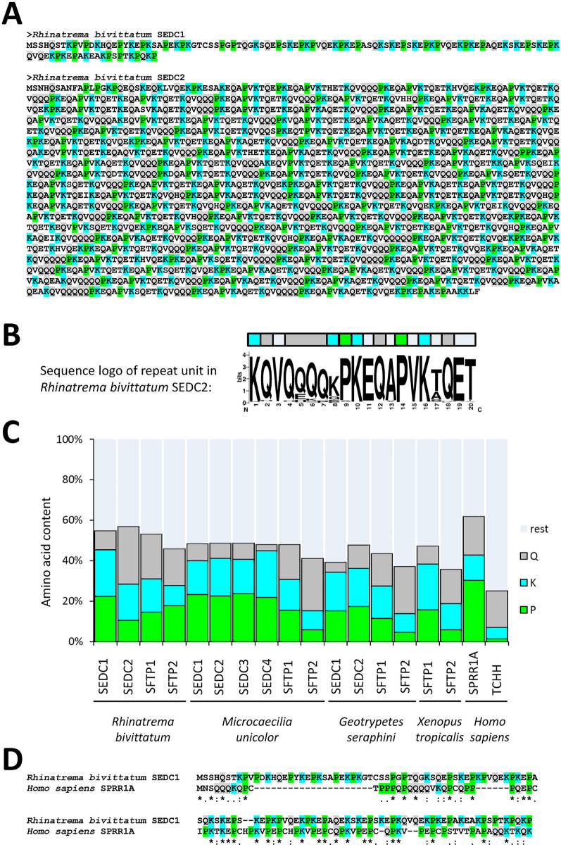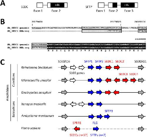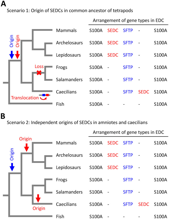 The epidermal differentiation complex (EDC) is a cluster of genes encoding components of the skin barrier in terrestrial vertebrates. EDC genes can be categorized as S100 fused-type protein (SFTP) genes such as filaggrin, which contain two coding exons, and single-coding-exon EDC (SEDC) genes such as loricrin. SFTPs are known to be present in amniotes (mammals, reptiles and birds) and amphibians, whereas SEDCs have not yet been reported in amphibians. Here, we show that caecilians (Amphibia: Gymnophiona) have both SFTP and SEDC genes. Two to four SEDC genes were identified in the genomes of Rhinatrema bivittatum, Microcaecilia unicolor and Geotrypetes seraphini. Comparative analysis of tissue transcriptomes indicated predominant expression of SEDC genes in the skin of caecilians. The proteins encoded by caecilian SEDC genes resemble human SEDC proteins, such as involucrin and small proline-rich proteins, with regard to low sequence complexity and high contents of proline, glutamine and lysine. Our data reveal diversification of EDC genes in amphibians and suggest that SEDC-type skin barrier genes have originated either in a common ancestor of tetrapods followed by loss in Batrachia (frogs and salamanders) or, by convergent evolution, in caecilians and amniotes.