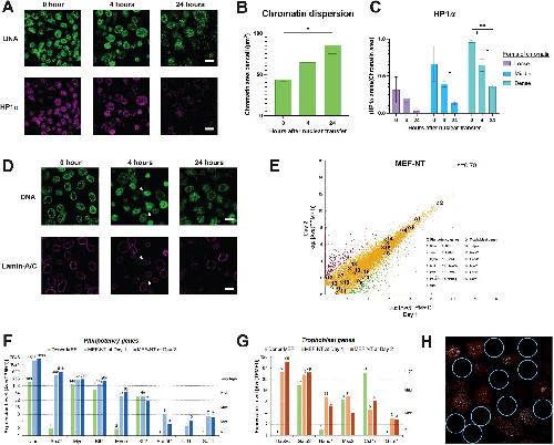 Completion of transcriptional reprogramming to a totipotency-like state by oocytes within 24 h after nuclear transfer. (A) Images show the dispersion of chromatin (in green) and loss of HP1α (in magenta) in MEF after nuclear transfer. Scale bars: 10 µm. (B) Bar chart shows that the chromatin in MEFs dispersed by twofold in area at 24 h after nuclear transfer. Error bars represent±SD. *P<0.05 by the Student's t-test, n=3. (C) Bar chart shows the loss of HP1α in three density levels of chromatin in MEFs from 4 h onwards. At all three time points, the more condensed the chromatin is, the more areas of chromatin occupied by HP1α. Error bars represent±SD. *P<0.05, **P<0.01 by the Student's t-test, n=3. (D) Images show the breakdown of nuclear envelope (in magenta) and burst of chromatin (in green) in nuclei of injected MEF after nuclear transfer. The breakdown of nuclear envelope where chromatin burst was observed (white arrowhead) at 4 h after nuclear transfer. Scale bars: 10 µm. (E) Dot plot shows the high correlation (r=0.78) of transcriptomes between day 1 and day 2 after MEF nuclei transplanted into Xenopus meiotic oocytes. (F,G) Pluripotency genes (F) and trophoblast genes (G) in transplanted MEFs were activated by oocyte factors on day 1 after nuclear transfer and remain at the same expression level on day 2. (H) Sox2 transcripts (white spots) were activated by oocyte factors in all transplanted MEFs at 24 h after nuclear transfer. The red color shows TO-PRO-1 stain for chromatin of MEFs. The areas outlined in blue show the absence of hybridized probes to the background areas between MEF nuclei.