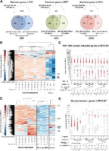 Retention of gene resistance to oocyte reprogramming after the completion of oocyte reprogramming. (A) Venn diagram shows the differentiated MYO nuclei are more resistant to oocyte reprogramming than embryonic ESC and MEF. Among oocyte-inducible genes, the differentially expressed genes (fold change≥ 4) indicates the gene resistance in certain cell types with lower gene expression after nuclear transfer. Considering the transcriptional activity of donor cells may affect the results, genes that are downregulated by oocytes and shown in the oocyte-resistant genes are excluded. (B) Heatmap shows three cell types respond to oocyte reprogramming similarly for the top 1500 highly expressed oocyte-induced genes in MYO-NT. The top 1500 highly expressed genes in MYO-NT includes pluripotency genes, Jun, Klf4 and Myc. (C) Boxplot shows the transcriptional increase in numbers (TPM) for the top 1500 highly expressed oocyte-induced genes in MYO-NT. (D) Heatmap shows the different response among three cell types to oocyte reprogramming for the oocyte-resistant genes in MYO-NT. Oocyte-resistant genes in MYO-NT include six pluripotency genes, Klf2, Sox2, Pou5f1, Sall4, Utf1 and Mycn. (E) Boxplot shows the transcriptional changes in numbers (TPM) for the oocyte-resistant genes in MYO-NT.