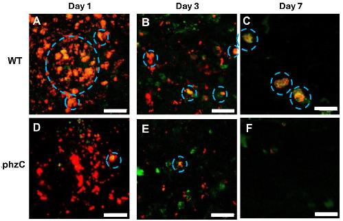 Figure 6. Visualization of macrophage recruitment and infection following 1, 3, and 7 days following tadpoletail wound inoculation using intravital confocal microscopy. DsRed WT (A–C) or ∆phzC (D–F) Mab were inoculated with a biopsy punch in the tailmuscle of mpeg:GFP transgenic tadpoles (stage 56). GFP mpeg1+ macrophage (green) and DsRed mycobacteria-infected macrophages (red+ green+) were monitored in live tadpoles at 1, 3, and 7 dpi by confocal microscopy (Leica DMi8 Inverted Microscope). Overlayed (red+/green+) signal is shown. Infected macrophages are circled. Size bar: 10 μm.