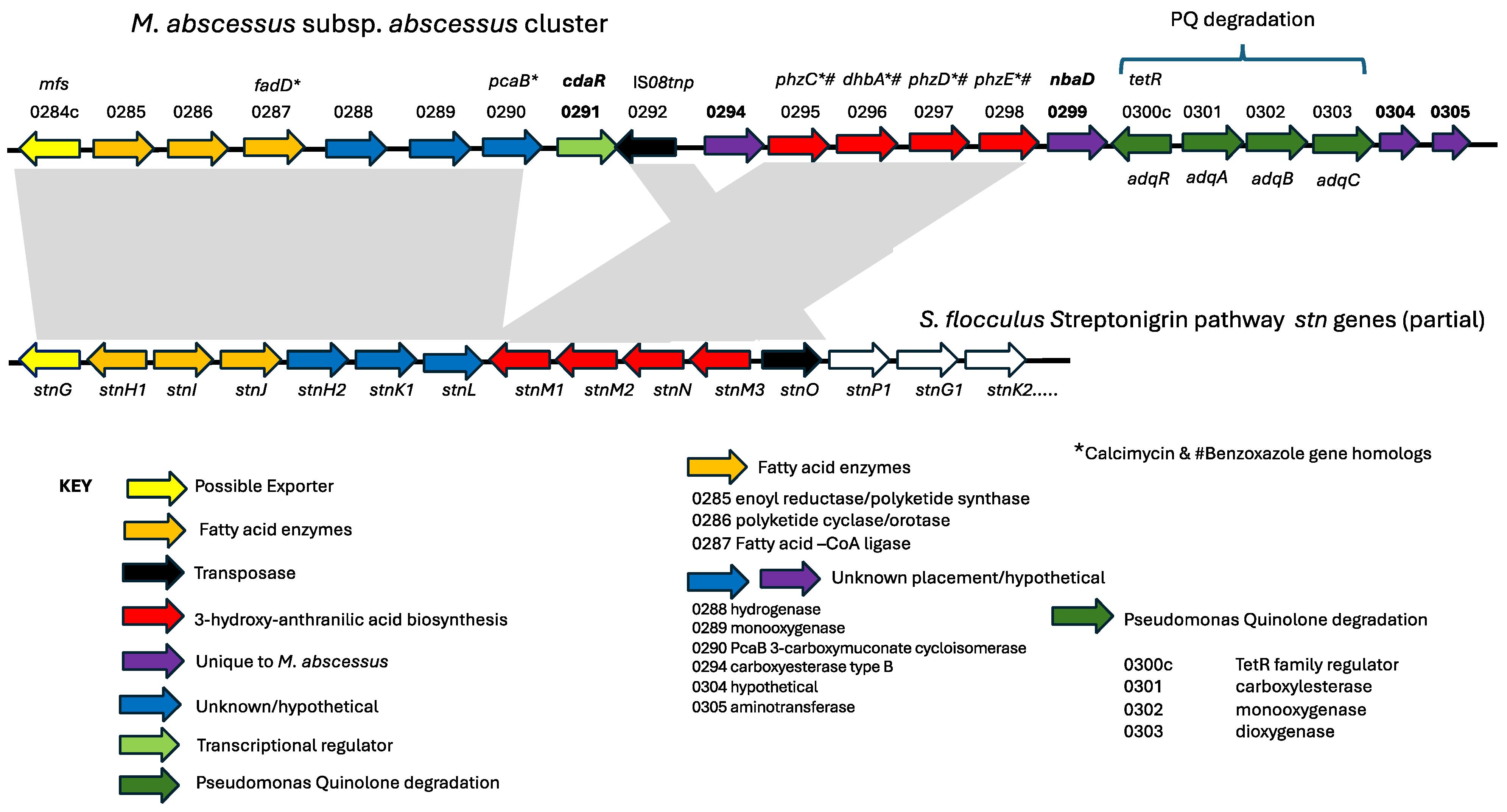Figure 1. Putative secondary metabolite pathway in M. abscessus. The cluster of genes (MAB_0284c to MAB_0305) is shown at the top, with the MAB ORF number designations from the genome of M. abscessus ATTC 19977. Embedded within the cluster are MAB_0330c to MAB_0303, also known as the adqRABC cluster, which has been shown to be responsible for the degradation of quinolone signaling molecules from P. aeruginosa [31]. The MAB_0284c to MAB_0290 genes are syntenic with those in the streptonigrin pathway genes (stnG to stnL), as shown below the Mab cluster. MAB_0290 and MAB_0295 to MAB_0298 are also syntenic with the streptonigrin genes, except that they are inverted in Mab and include two additional genes, a transcriptional regulator (MAB_0291, cdaR) and a putative carboxyesterase (MAB_0294). Mab gene products that are homologous to those in the calcimycin and benzoxazole pathways are indicated (* or #). Genes unique to the Mab cluster are shown in bold: MAB_0291 (cdaR), MAB_0294 (putative carboxyesterase), MAB_0299 (nbaD, a putative aminohydrolase), MAB_0304 (hypothetical), and MAB_0305 (putative aminotransferase). Predicted functions of some of the gene products are color-coded in the key.