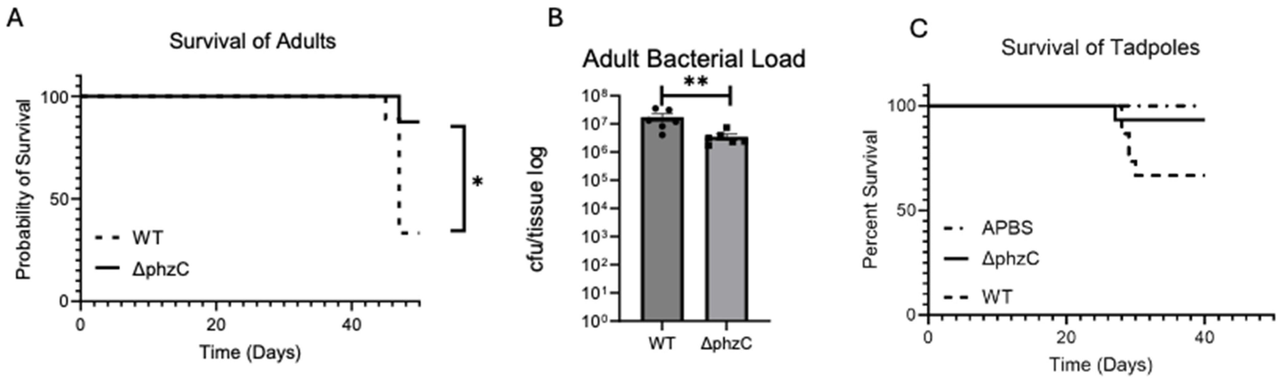 Figure 2. Survival of adult frogs and tadpoles following ip inoculation with either WT Mab or ∆phzC Mab. (A) One-year-old frogs (six per group) were (ip) inoculated with 5 × 105 CFU of WT or ∆phzC Mab and monitored for 50 days for survival. (B) The bacterial loads in livers of adult frogs from A, determined at the end of the experiment. (C) Two-week-old tadpoles (st. 44–45, 10 per group), were inoculated with 5 × 105 CFU of WT or ∆phzC Mab. As a negative control, tadpoles were injected with APBS. Survival was monitored for 50 days for survival. Statistical differences between groups were assessed by a log-rank (Mantel–Cox) test (* p > 0.05; ** p > 0.001).