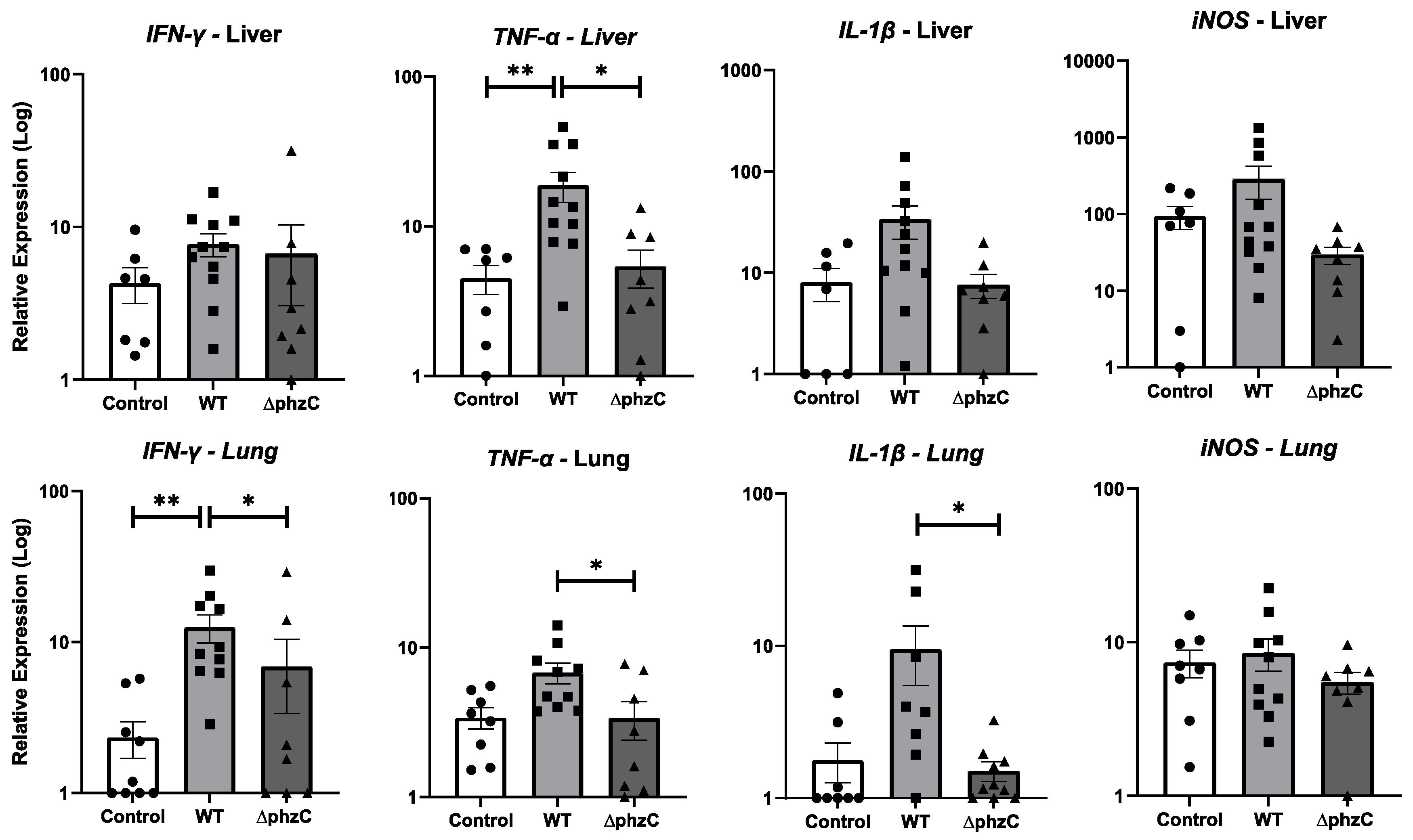Figure 4. Change in relative gene expression of tadpole livers and lungs at 14 days post-infection with WT or ∆phzC Mab. Three-week-old tadpoles (stage 55; 10 per group) were (ip) inoculated with 5 × 105 CFU of either WT or ∆phzC Mab, or injected with APBS as a negative control (Control). RNAs from the collected livers and lungs were used to determine gene expression for TNF-α, IL-1β, IFN-I, iNOS, and IFN-γ. Gene relative quantification (RQ) was determined as the fold increase relative to the GAPDH endogenous control, normalized to the lowest expression level. Bars represent standard deviations (n = 10 animals). Statistical differences between the groups were determined by one-way ANOVA and Tukey’s post hoc test. (**) p > 0.001; (*) p > 0.05.
