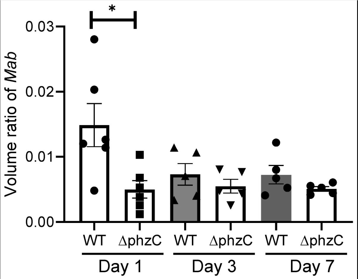 Figure 3. Changes in bacterial loads in tadpoles following (ip) inoculation with WT or ∆phzC Mab. Three-weeks-old tadpoles (stage 55; 10 per group) were (ip) inoculated with 5 × 105 CFU of either WT or ∆phzC Mab. Colony assays was performed on liver lysates at 1 and 14 days post-infection. One tadpole per condition was also tested 2 h post-infection to control the initial infection load. Statistical differences between the groups was determined by t-test (* p > 0.05).
