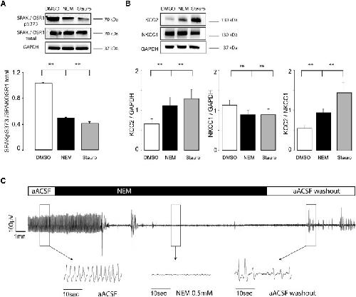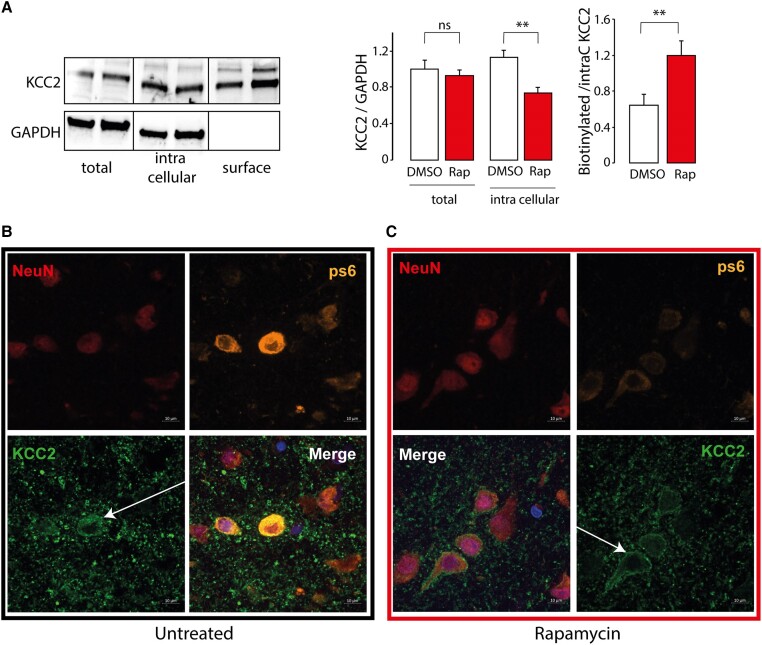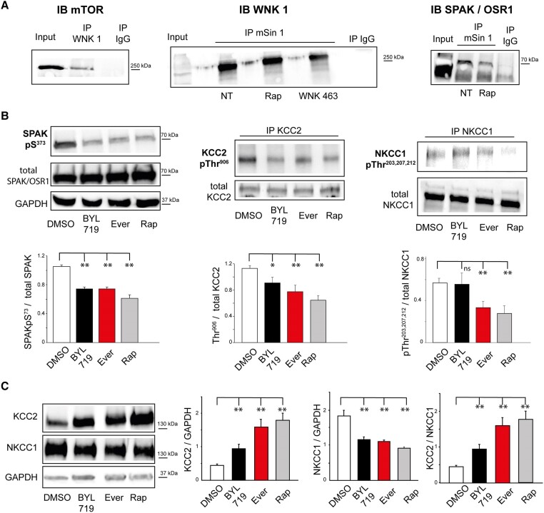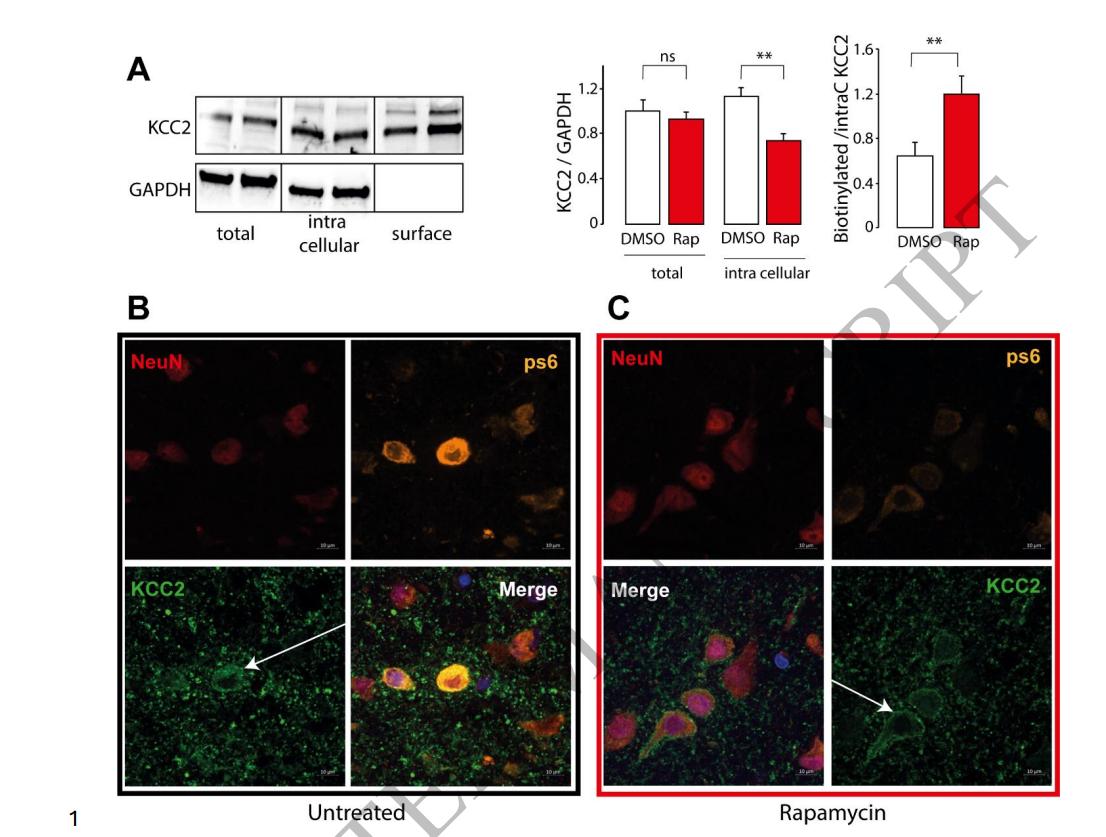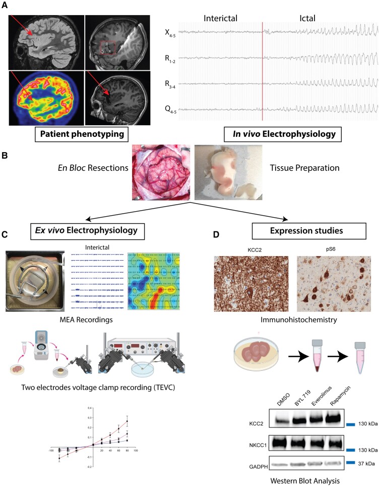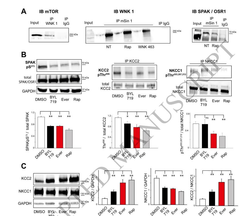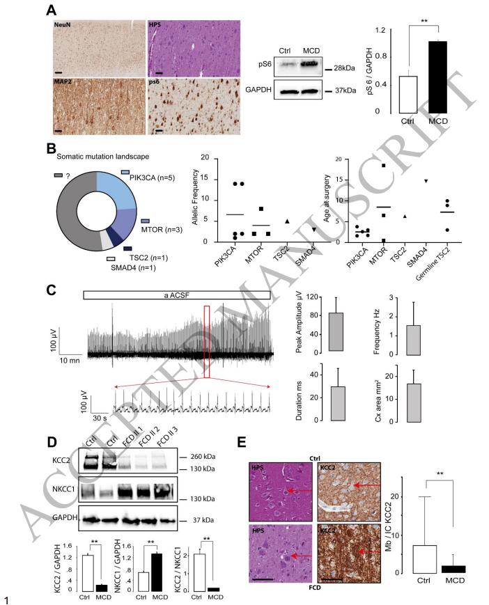 Focal Cortical Dysplasia, Hemimegalencephaly and Cortical Tuber are pediatric epileptogenic malformations of cortical development (MCDs) frequently pharmaco-resistant and mostly surgically treated by the resection of epileptic cortex. Availability of cortical resection samples allowed significant mechanistic discoveries directly from human material. Causal brain somatic or germline mutations in the AKT/PI3K/DEPDC5/MTOR genes were identified. GABAa mediated paradoxical depolarization, related to altered chloride (Cl-) homeostasis, was shown to participate to ictogenesis in human pediatric MCDs. However, the link between genomic alterations and neuronal hyperexcitability is still unclear. Here we studied the post translational interactions between the mTOR pathway and the regulation of cation-chloride cotransporters (CCC), KCC2 and NKCC1, that are largely responsible for controlling intracellular Cl- and ultimately GABAergic transmission. For this study, 35 children (25 MTORopathies and 10 pseudo controls, diagnosed by histology plus genetic profiling) were operated for drug resistant epilepsy. Postoperative cortical tissues were recorded on multielectrode array (MEA) to map epileptic activities. CCC expression level and phosphorylation status of the WNK1/SPAK-OSR1 pathway was measured during basal conditions and after pharmacological modulation. Direct interactions between mTOR and WNK1 pathway components were investigated by immunoprecipitation. Membranous incorporation of MCD samples in Xenopus laevis oocytes enabled Cl- conductance and equilibrium potential (EGABA) for GABA measurement. Of the 25 clinical cases, half harbored a somatic mutation in the mTOR pathway, while pS6 expression was increased in all MCD samples. Spontaneous interictal discharges were recorded in 65% of the slices. CCC expression was altered in MCDs, with a reduced KCC2/NKCC1 ratio and decreased KCC2 membranous expression. CCC expression was regulated by the WNK1/SPAK-OSR1 kinases through direct phosphorylation of Thr906 on KCC2, that was reversed by WNK1 and SPAK antagonists (NEM and Staurosporine). mSIN1 subunit of MTORC2 was found to interact with SPAK-OSR1 and WNK1. Interactions between these key epileptogenic pathways could be reversed by the mTOR specific antagonist Rapamycin, leading to a dephosphorylation of CCCs and recovery of the KCC2/NKCC1 ratio. The functional effect of such recovery was validated by the restoration of the depolarizing shift in EGABA by rapamycin, measured after incorporation of MCD membranes to X. laevis oocytes, in line with a reestablishment of normal ECl-. Our study deciphers a protein interaction network through a phosphorylation cascade between MTOR and WNK1/SPAK-OSR1 leading to chloride cotransporters deregulation, increased neuronal chloride levels and GABAa dysfunction in malformations of Cortical Development, linking genomic defects and functional effects and paving the way to target epilepsy therapy.