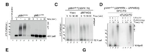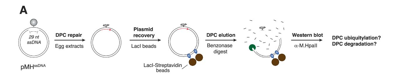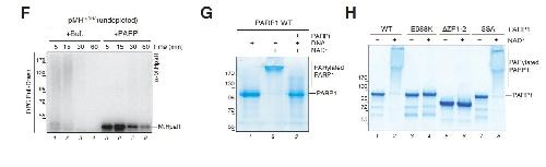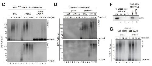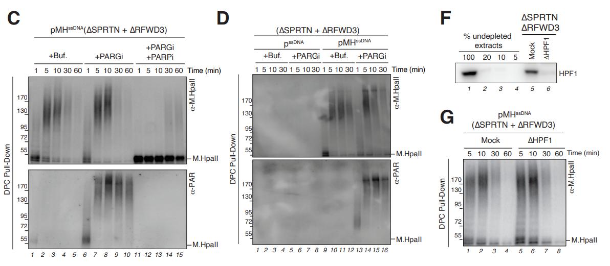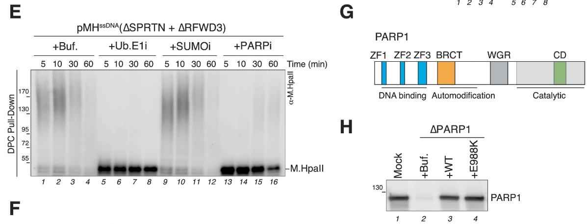 Supplementary Figure 2. A) In vitro autoPARylation assay of WT and E988K PARP1 in the presence and absence of HPF1. Top panel corresponds to immunoblot of PARP1; bottom panel correspond to Coomassie stain of HPF1. B) In vitro PARylation of the indicated DPCs, with and without NAD+. Samples were analyzed by SDS-PAGE and immunoblotted for indicated proteins C) pMHssDNA were added to RFWD3- and SPRTNdepleted HSS supplemented with PARG inhibitor (PARGi) or with PARGi+PARPi. Samples were recovered via DPC pull-down and immunoblotted with either M.HpaII or Poly/Mono-ADP Ribose antibody (a-PAR). D) pssDNA and pMHssDNA were incubated in SPRTN-RFWD3 depleted HSS supplemented with PARGi where indicated. DPC degradation and PARylation were monitored as in (C). E) Experimental setup for studying in vitro PARylated pMHssDNA repair in egg extracts. In vitro PARylated pMHssDNA was incubated in SPRTN-RFWD3-PARP1 depleted HSS in the absence and presence of PARGi. DPC degradation and PARylation were monitored as in (C). F) HSS dilution series and depletion controls of HPF1. G) pMHssDNA were incubated in SPRTN-RFWD3- and HPF1-depleted HSS. DPC degradation was monitored as in (C). |