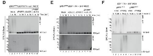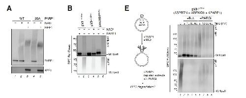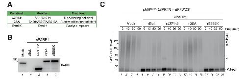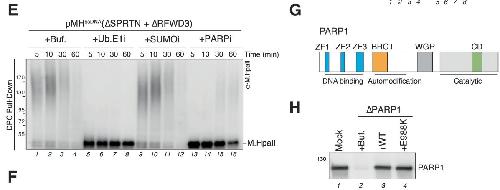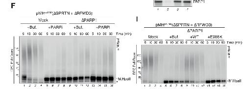Fig. 2: PARP1-dependent DPC PARylation triggers DPC ubiquitylation and resolution. A Overview table of PARP1 mutants. B SPRTN-RFWD3-depleted HSS was further mock- or PARP1-depleted and immunoblotted with PARP1 antibody. PARP1-depleted extracts were also supplemented with either buffer (+Buf.), DNA-binding deficient mutant (+ΔZF1-2), automodification-deficient mutant (+3SA), or catalytically impaired mutant PARP1 (+E988K). C Add-back rescue experiment using the extracts from B. DPCs were recovered by DPC pull-down and monitored via blotting against M.HpaII. The asterisk denotes an unspecific band. D pMHssDNA was incubated in RFWD3-SPRTN-depleted HSS in the presence of PARPi or E1 ubiquitin-activating enzyme inhibitor (Ub.E1i) alone or in combination. Samples were recovered via DPC pull-down and immunoblotted with either M.HpaII or Poly/Mono-ADP Ribose antibody (α-PAR). E pMHssDNA was incubated in SPRTN-RFWD3-depleted HSS, which was then either mock- or PARP1-depleted in the presence of Ub.E1i where indicated. DPC degradation and PARylation were monitored as in D. F pMHssDNA and pMHdsDNA were incubated in SPRTN-RFWD3-depleted HSS supplemented with PARGi where indicated. DPC degradation and PARylation were monitored as in D. Source data are provided as a Source Data file. |