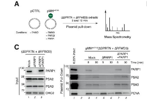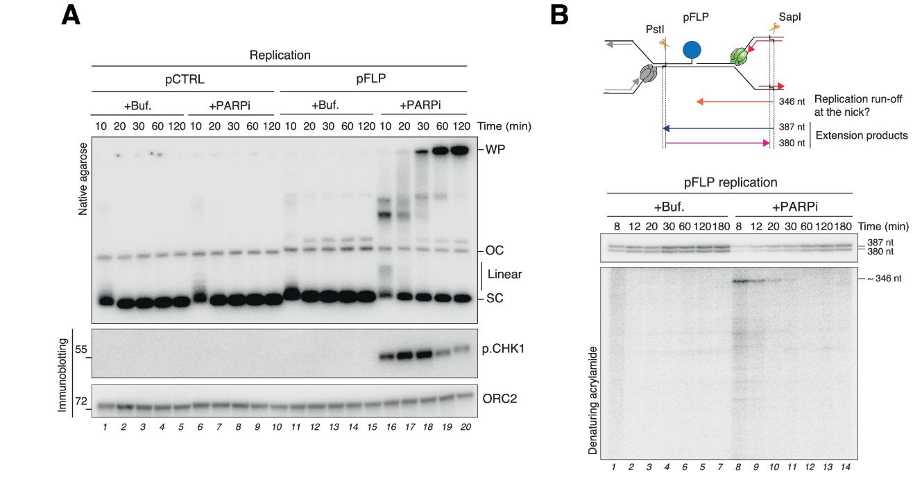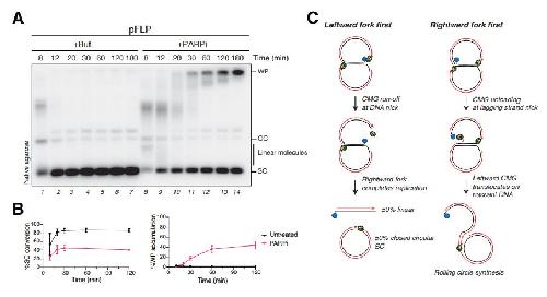 Supplementary Figure 6. A) Samples taken from [a32P]dATP labelled reaction in experiment 5B and run on a native agarose gel. B) Quantification of supercoiled (SC) and well products (WP) from Figure 5A. Error bars represent the SD. n=3. C) Model of pFLP replication in the presence of PARPi. |