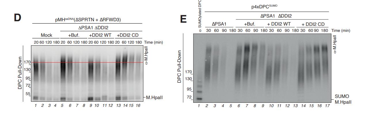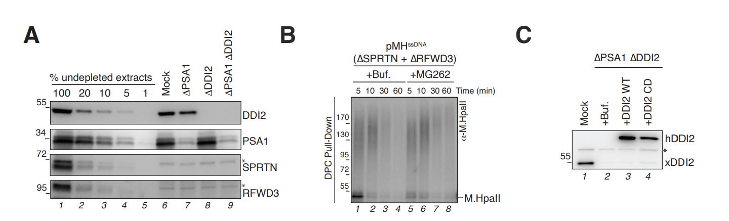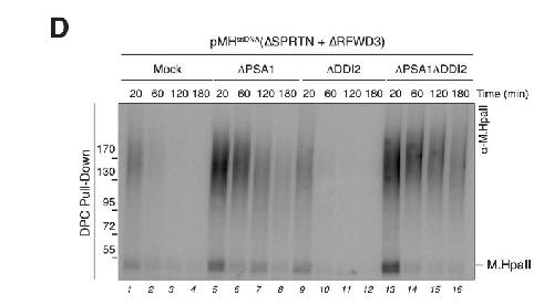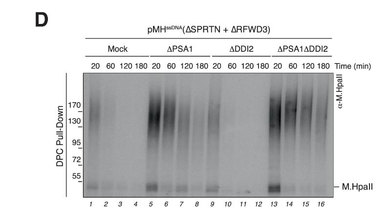 Fig. 3: Plasmid Pull-down Mass Spectrometry (PP-MS) reveals proteasome and PAR-dependent E3 ubiquitin ligase recruitments. A Overview of reaction conditions for PP-MS analysis. B Heatmap showing the mean of the z-scored log2 label-free quantitation (LFQ) intensity (i.e., protein abundance) from four biochemical replicates of pCTRL and pMHssDNA incubated in SPRTN-RFWD3-depleted HSS in the presence of the indicated inhibitors. Dynamic proteins, responsive to PARGi and/or PARPi treatment, were selected. C pMHssDNA was incubated in SPRTN-RFWD3-depleted HSS, which was then additionally mock-depleted, PARP1-depleted, or PARP1-depleted and supplemented with recombinant PARP1 (Input, left WB). Plasmids were recovered via plasmid pull-down and protein recruitment to the plasmid was monitored with the indicated antibodies. D pMHssDNA was incubated in SPRTN-RFWD3-depleted HSS, which was further mock-depleted, PSA1-depleted, DDI2-depleted, or PSA1- and DDI2-depleted. Samples were recovered by DPC pull-down and immunoblotted against M.HpaII. Source data are provided as a Source Data file. |