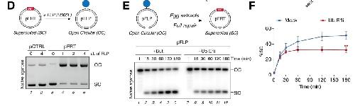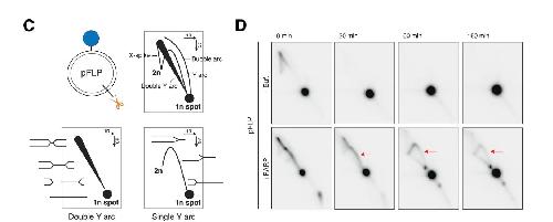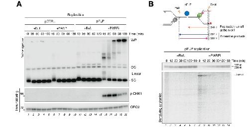 Fig. 5: Inhibition of pFLP repair leads to replisome disassembly during DNA replication. A pCTRL and pFLP were replicated in the presence or absence of [α-32P]dATP and PARPi (licensing in one volume of HSS for 60 min followed by the addition of two volumes of NPE). Samples were retrieved at indicated time points following NPE addition and analyzed by native agarose gel electrophoresis (top radiograph) or western blotting (bottom immunoblots). Samples were immunoblotted for p.CHK1 and loading control (ORC2). B Top, leftward, and rightward fork models of replisome disassembly when encountering the Flp-nick crosslink. Bottom, pFLP was replicated in the presence of [α-32P]dATP and with or without PARPi. Samples were retrieved at indicated time points, phenol-chloroform extracted, digested with PstI and SapI, and resolved on a denaturing polyacrylamide gel. C Schematic of pFLP linearization by ScaI and the potential DNA species occurring on a 2D gel upon plasmid replication. D Indicated samples from (B) were linearized by ScaI and run in two dimensions. Source data are provided as a Source Data file. |