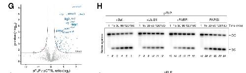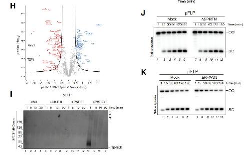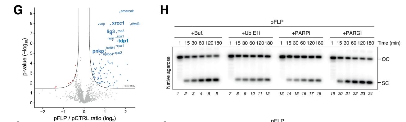 Supplementary Figure 5. A) Levels of PARP1 and b-actin protein in cell extracts from XRCC1-/- RPE-1 cells following transfection with control or anti-PARP1 siRNA. B) SSB levels measured by alkaline comet assays in the cell lines described in (A), following incubation for 1 h with 10 µM camptothecin. For each sample, data show the median Tail moment of 200 cells combined from two independent experiments (100 cells/experiment). C) pCTRL and pFLP samples were analyzed on a native agarose gel in the presence of EtBr. Where indicated, substrates were digested with PvuII restriction enzyme to release a 500 nt long DNA fragment containing the crosslinked protein. Gel shift indicates successful crosslinking. D) pFLPPK was incubated in non-replicating egg extracts (1:2 HSS:NPE ratio) in the absence and presence of Ub.E1i. Reaction samples were analyzed by native agarose gel electrophoresis. E) TDP1-depleted non-replicating egg extracts (1:2 HSS:NPE ratio) were blotted with a TDP1 antibody. Asterisk marks an unspecific band. F) pFLP was incubated in mock- or TDP1-depleted non-replicating egg extracts (1:2 HSS:NPE ratio). Reaction samples were analyzed by native agarose gel electrophoresis. G) Samples from (F) were quantified as in (Fig. 4F). Error bars represent the SD of the mean. n=6. Significant differences were determined by a two-tailed unpaired t test. ** denotes p-value ≤ 0.01 compared to the Mock control (p=0.0132). H) Analysis of protein recruitment to pFLP in TDP1-depleted compared to mock-depleted non-replicating egg extracts (1:2 HSS:NPE ratio). Plasmids were recovered at 10 min. The volcano plot shows the difference in abundance of proteins between the two sample conditions (xaxis), plotted against the p-value resulting from two-tailed Student’s t-testing (y-axis). Proteins significantly down- or up-regulated (cutoff line represents permutation-based FDR<5%) are represented in red or blue, respectively. n=4. Full results reported in Table S3. I) pFLP was incubated in non-replicating egg extracts (1:2 HSS:NPE ratio) in the presence of the indicated inhibitors. Samples were recovered via DPC pull-down and blotted against Poly/Mono-ADP ribose antibody (a-PAR). J) pFLP was incubated in mockand SPRTN-depleted egg extracts. Reaction samples were analyzed by native agarose gel electrophoresis. K) pFLP was incubated in mock- and RFWD3-depleted egg extracts. Reaction samples were analyzed as in (J). |