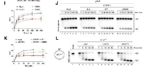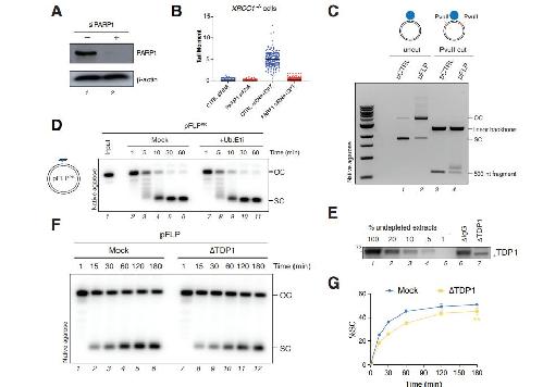 Fig. 4: PARP1 orchestrates TOP1cc and TOP1cc-like DPC repair. A Schematic illustrating the current model of TOP1cc repair. B PARP1 deletion suppresses the visibility of camptothecin-induced SSBs. The indicated RPE-1 cells were incubated with 10 µM camptothecin for 1 h and then processed for alkaline comet assays to measure unrepaired SSBs. Data show the median Tail moment of 300 cells combined from three independent experiments (100 cells/experiment). Significant differences were determined by 2-way ANOVA with Sidak’s post hoc multiple comparisons test. CPT denotes camptothecin. **** denotes p-value ≤0.0001. C Proteasome inhibition and/or PARP1 deletion suppresses the visibility of camptothecin-induced SSBs in the alkaline comet assay pre-treated with proteasome inhibitor (50 µM MG132) 2 h prior to and during camptothecin treatment as above. D To generate pFLP, Flp-nick is crosslinked to a plasmid containing the FRT site. Products of Flp-nick incubation with a CTRL (pCTRL) or FRT-site containing plasmid (pFRT) were analyzed on a native agarose gel. E pFLP was incubated in non-replicating egg extracts (1:2 HSS:NPE ratio) in the absence and presence of Ub.E1i. Reaction samples were analyzed by native agarose gel electrophoresis. F Quantification of the experiment shown in E. Error bars represents the SD of the mean. n = 3 independent experiments. Significant differences were determined by a two-tailed unpaired t-test. ** denotes p-value ≤0.01 (p = 0.0061). G Analysis of protein recruitment to pFLP compared to pCTRL via PP-MS. Plasmids were recovered at 10 min after addition in non-replicating egg extracts (1:2 HSS:NPE ratio). The volcano plot shows the difference in the abundance of proteins between the two sample conditions (x-axis), plotted against the p-value resulting from two-tailed Student’s two-sample t-testing (y-axis). Proteins significantly down- or up-regulated (cutoff line represents permutation-based FDR < 5%) are represented in red or blue, respectively. n = 4. H pFLP was incubated in non-replicating egg extracts (1:2 HSS:NPE ratio) in the absence and presence of the indicated inhibitors. Reaction samples were analyzed as in (E). I Quantification of the experiment shown in (H) as in (F). Error bars represent the SD of the mean. n = 3 independent experiments. Significant differences were determined by a two-tailed unpaired t-test. ** denotes p-value ≤0.01 compared to the Mock control (p = 0.0052 for PARPi and p = 0.0061 for Ub.E1i). J Add-back rescue experiment with WT and E988K PARP1 in non-replicating egg extracts (1:2 HSS:NPE ratio). Reaction samples were analyzed as in (E). K Samples from (J) were quantified as in (F). Error bars represent the SD of the mean. n = 3 independent experiments. Significant differences were determined by a two-tailed unpaired t-test. *** and **** denote p-value ≤0.001 and p-value ≤ 0.0001 compared to the Mock control, respectively. ** denotes p-value ≤0.01 compared to the PARP1 depletion control (p = 0.0054). * denotes p-value ≤0.05 compared to Mock control (p = 0.02). L pFLPPK was incubated in non-replicating egg extracts (1:2 HSS:NPE ratio) egg extracts in the absence and presence of Ub.E1i or in PARP1-depleted egg extracts. Reaction samples were as in E. Source data are provided as a Source Data file. |