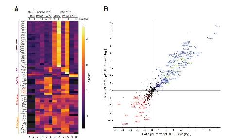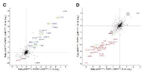Supplementary Figure 3. A) Heatmap showing the mean of the Z-scored log2 label-free quantitation (LFQ) intensity (i.e. protein abundance) from four biochemical replicates of pCTRL, pmeMHssDNA and pMHssDNA incubated in SPRTN-RFWD3 depleted HSS in the presence of the indicated inhibitors. Dynamic proteins, responsive to PARGi and/or PARPi treatment, were selected. The experiment shown is the same as the one in Figure 3, but with the pmeMHssDNA added to the analysis. B) Scatter plot analysis of protein recruitment to pMHssDNA. The mean log2abundance ratio between proteins enriched in the pMHssDNA compared to pCTRL at 5 min is plotted against the abundance ratio at 10 min. Blue and red dots indicate proteins significantly recruited to or excluded from pMHssDNA compared to pCTRL, respectively. Ubiquitin E3 ligases are highlighted in green. Significance was determined by two-tailed Student’s two-sample t test with s0 = 0.1 and FDR ≤ 0.05. n=4. Full results reported in Table S1. Note that different isoforms of the same protein can be detected (e.g. TRIP12). B-D) Scatter plot analysis of protein recruitment to pMHssDNA in the presence of PARGi or PARPi presented in (C) but in the pMHssDNA + inhibitor / pMHssDNA conditions. |