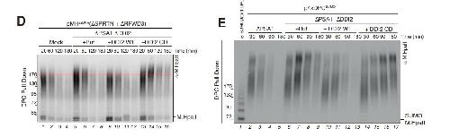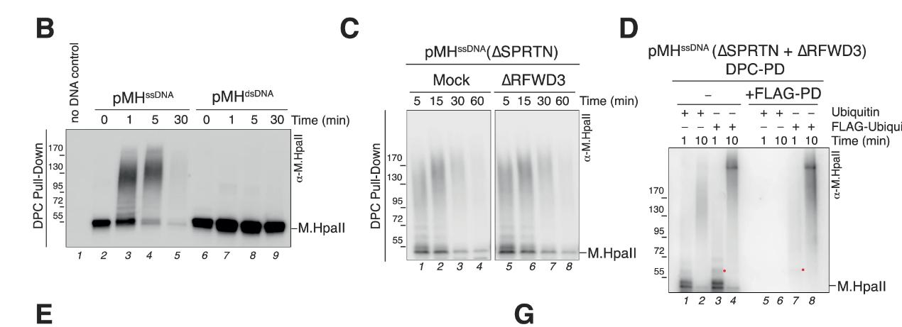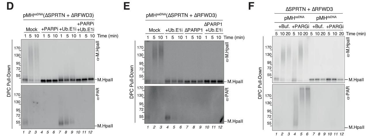 Fig. 1: DPCs on ssDNA gaps are ubiquitylated in a PARP1-dependent manner. A Schematic of DPC pull-down assay9. At given time points, the DPC plasmid is pulled down under stringent conditions, the DNA is digested by benzonase treatment, and M.HpaII is analyzed via immunoblotting. Note that although the M.HpaII antibody is generated against full-length M.HpaII, it is unlikely to recognize all degradation products. B pMHssDNA or pMHdsDNA were incubated in high-speed supernatant extract (HSS, which is an extract that does not support DNA replication) and recovered by DPC pull-down at the indicated time points and immunoblotted for crosslinked M.HpaII. Molecular weight marker (kDa) is indicated on the left side of the blot and in all subsequent blots presented in this manuscript. C pMHssDNA was incubated in SPRTN- or SPRTN- and RFWD3-depleted HSS and retrieved at the indicated time points by DPC pull-down as in B. D pMHssDNA repair in SPRTN- and RFWD3-depleted HSS. Reactions were supplemented with untagged- or FLAG-tagged recombinant ubiquitin. For each condition, a sample was retrieved at 1 and 10 min, and was first recovered by DPC pull-down (DPC-PD), subsequently by FLAG pull-down (FLAG-PD), and immunoblotted for crosslinked M.HpaII. E pMHssDNA was incubated in SPRTN- and RFWD3-depleted HSS in the presence of the indicated inhibitors. DPCs were recovered via DPC pull-downs at the indicated time points and immunoblotted for crosslinked M.HpaII. Note that the small upshift of M.HpaII signal observed in the presence of Ub.E1i (lanes 5 and 6) is due to M.HpaII PARylation (see Fig. 2D). F pMHssDNA repair in SPRTN- and RFWD3-depleted HSS, which was further mock- or PARP1-depleted in the presence and absence of PARP inhibitor (PARPi). Samples were recovered by DPC pull-down and immunoblotted for crosslinked M.HpaII. The asterisk marks an unspecific band. G Scheme of PARP1. It consists of three main domains: an N-terminal DNA-binding domain (DBD) consisting of zinc-finger (ZF) motifs, a central BRCT domain-containing automodification domain, and a conserved C-terminal catalytic domain (CD). H SPRTN-RFWD3-depleted HSS was further mock- or PARP1-depleted and blotted with PARP1 antibody. PARP1-depleted extracts were supplemented with either buffer (+Buf.), recombinant hPARP1 (+WT), or recombinant catalytically impaired E988K mutant (+E988K). I Add-back rescue experiment using the extracts from H. Samples were recovered by DPC pull-down and immunoblotted against M.HpaII. Source data are provided as a Source Data file. |