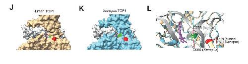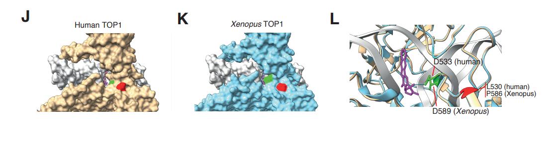 Supplementary Figure 4. A) DDI2-, PSA1-, SPRTN- and RFWD3-depleted HSS were blotted with the indicated antibodies. Asterisk marks an unspecific band. B) pMHssDNA repair in SPRTN-RFWD3 depleted HSS with or without proteasome inhibitor (MG262). DPCs were recovered via DPC pull-downs at the indicated time points and immunoblotted for crosslinked M.HpaII. C) Mock-depleted and PSA1-DDI2 depleted HSS were blotted with DDI2 antibody. PSA1-DDI2 depleted extracts were supplemented with either buffer (+Buf.), recombinant hDDI2 (+DDI2 WT), or recombinant catalytic dead D252N mutant (+DDI2 CD). D) Add-back rescue experiment in HSS with WT and CD DDI2. Samples were recovered via DPC pull-down and immunoblotted for crosslinked M.HpaII. Red line indicates the shift in high molecular weight species. E) p4xDPCSUMO was incubated in NPE (no DNA replication) for 60 min and transferred to PSA1-, or PSA1- and DDI2- depleted mitotic extracts (Liu et al., 2021), supplemented with either recombinant HisSUMO tagged WT or catalytic inactive D252N mutant hDDI2 as indicated. Samples were recovered by DPC pull-down and immunoblotted against M.HpaII. F) pMHLeads was replicated in mock-, SPRTN-, SPRTN- and PSA1-, or SPRTN-, PSA1- and DDI2-depleted egg extracts in the presence of [a32P]dATP (licensing in one volume of HSS for 30 min followed by addition of two volumes of NPE). Samples were analyzed on a native agarose gel. G) Samples from (F) were recovered via DPC pull-down and immunoblotted for crosslinked M.HpaII. H) pCTRL was replicated in egg extracts (licensing in one volume of HSS for 30 min followed by addition of two volumes of NPE) in the presence of Etoposide (100 μM), ICRF-193 (10 μM) or Topotecan (200 μM) where indicated. In contrast to Etoposide and ICRF-193, Topotecan does not induce any abnormal DNA replication/repair intermediates. I) Same as (H) but using Camptothecin (CPT) (500 μM) instead of Topotecan. J) Human TOP1 (brown) with CPT (purple) and DNA (white) visualized in ChimeraX as a Spacefill model (PDB: 1T8I), here displaying the drug binding pocket with CPT and highlighting residue D533 (green) and L530 (red). K) Xenopus TOP1 structure (blue, residue 256-829) predicted by AlphaFold (P41512) aligned to human TOP1 and displayed as a Spacefill model in the same plane as (J) using ChimeraX. Residues corresponding to human D533 (Xenopus D589, green) and L530 (Xenopus P586, red) are highlighted. The DNA and CPT is shown as in (J). L) Drug binding pocket of aligned human and Xenopus TOP1 shown as a ribbon model using ChimeraX. Colors are as in (J) and (K) and relevant residues are annotated. Shown is the predicted hydrogen bond formed between CPT and D533 (blue dotted line). Looking at the aligned structures, we suspect that CPT cannot trap Xenopus TOP1 because of a L530 to Xenopus P586 substitution, which is causing a shift in the amino acid loop where the hydrogen bond between CPT and TOP1 is formed (at position D533 in human TOP1, marked in green). Importantly, a L530I substitution has previously been reported to cause CPT resistance in plants (Sirikantaramas et al., 2008). Moreover, looking at the surrounding cavity and access to the drug binding pocket, the predicted structural change caused by the leucine to proline substitution might be sufficient to prevent access of CPT to the TOP1 catalytic site (compare (J) with (K)). |