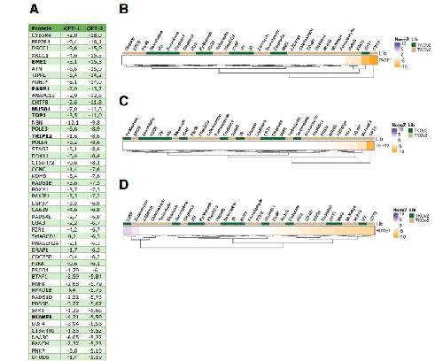Genes referenced: adrm1 anapc15 aplf atm aunip brca1 btaf1 cab39 ccnc cdc25b chek1 chfr chtf8 ctrl cul1 cul4a cul4b cyb5r4 dbf4 dclre1a ddi2 ddx11 drap1 dscc1 dtx3l eme1 esco1 fancm fbxl12 fen1 foxm1 fzr1 hira hltf hpf1 huwe1 kdm8 lig1 lig3 mus81 naa30 nbn nsfl1c nup42 otud5 parg parp1 parp12.3 parp9 paxip1 pds5b pnkp pold1 pold2 pold3 pole3 pole4 psma1 psma2 psma3 psma5 psma6 psma7 psmc1 psmc2 psmc3 psmc4 psmc5 psmc6 psmd11 psmd12 psmd13 psmd14 psmd2 psmd3 psmd4 psmd6 psmd7 psmd8 rad18 rad51d rad54l rnaseh2a rnf41 rnf8 rprd1b scai sfr1 smarcd1 sprtn stag2 sumo3 tdp1 tiprl top1 trafd1 trip12 uba3 ubb uchl5 ufd1 uhrf1 usp2 usp37 vcp xrcc1 xrcc5 xrcc6