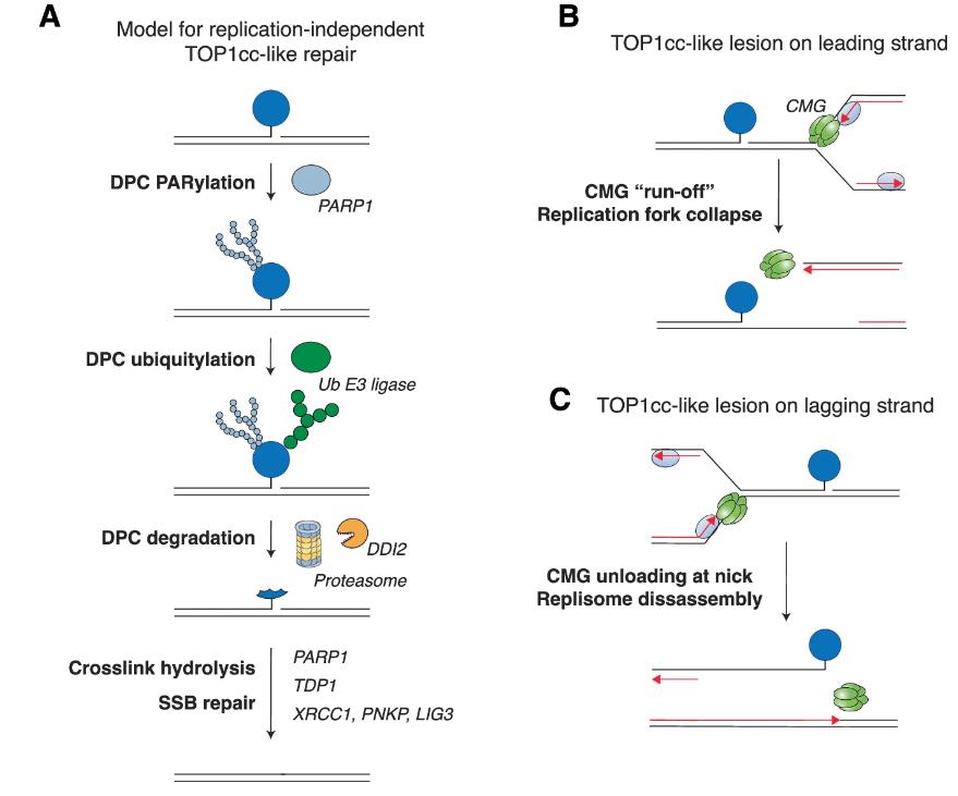 Fig. 6: Mechanism of PARP1-mediated DPC resolution. A Illustration of PARP1-mediated targeting of TOP1cc-like lesions. B In the absence of repair (e.g., PARPi) TOP1cc-like lesions encountered on the leading strand template induce CMG run-off. C Unrepaired TOP1cc-like lesions encountered on the lagging strand template induce CMG disassembly. |