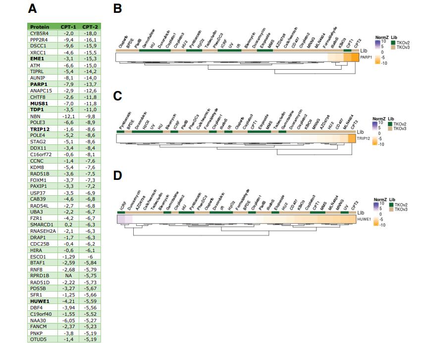 Supplementary Figure 7. A) Table extracted from (Olivieri et al., 2020). The table shows the top 50 genes whose targeting sensitize cells to the TOP1 poison camptothecin. Hits were ranked based on CPT-2 sensitivity. B-D) Heat map representations of PARP1 (B), TRIP12 (C), and HUWE1 (D) DrugZ (Colic et al., 2019) estimated sensitizing/resistance degree across 27 genotoxic agents tested under CRISPR/Cas9 screen experiments (Olivieri et al., 2020). Blue represents resistance (positive normZ scores) and orange represent sensitization (negative normZ scores). This data is copied from: https://durocher.shinyapps.io/GenotoxicScreens/ with the permission of Daniel Durocher. |