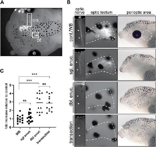 = 22). However, enucleation does not result in a dramatic increase in mitf-labeled cells in the perioptic region (