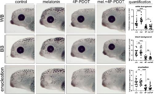 Figure 7. Melatonin signalling is necessary and sufficient to induce perioptic melanophore differentiation. Stage 40 larvae underwent sham surgery and were maintained in the light on a white background or black background, or were enucleated. Larvae from each condition were exposed to control, melatonin, melatonin receptor antagonist (4P-PDOT), or melatonin and 4P-PDOT solutions for a 24-h period. Melanophore numbers in the perioptic region (white dashed circle) were compared; White background: