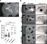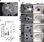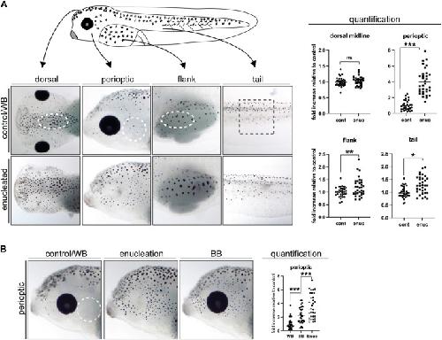Figure 5. Undifferentiated melanophores are maintained through larval stages. (A) Stage 40 larvae were exposed to different backgrounds while being illuminated from above for 24–48 h. (B) Larvae were maintain for 24 h on a white background (WB), for 48 h on a white background (WB + WB), for 24 h on a black background (BB), and for 24 h on a white background followed by 24 h on a black background (WB + BB). Perioptic melanophores were quantified (dashed circle in A;