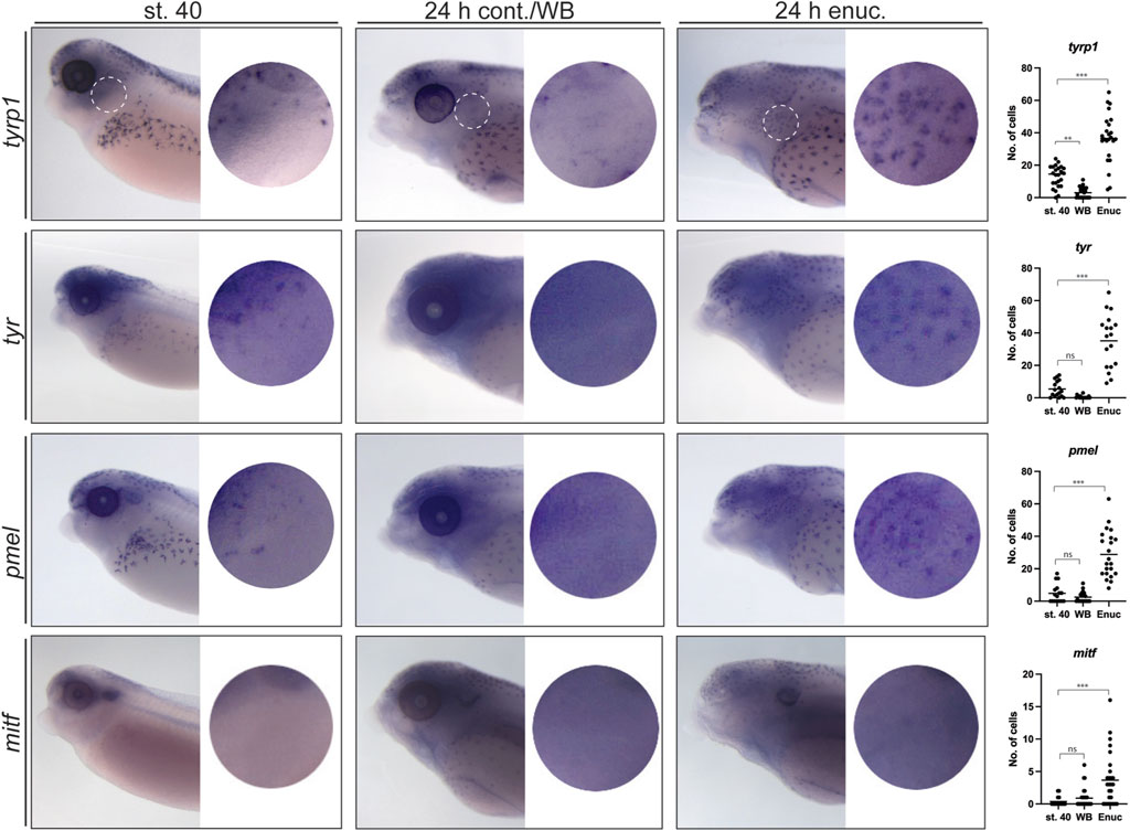 WB mitf = 0.89 ± 0.28, nWB mitf = 28). In contrast, WMISH reveals a dramatic increase in tyrp1, tyr, and pmel expressing cells in larvae enucleated at stage 40, prior to being maintained for 24 h in the light on a white background (