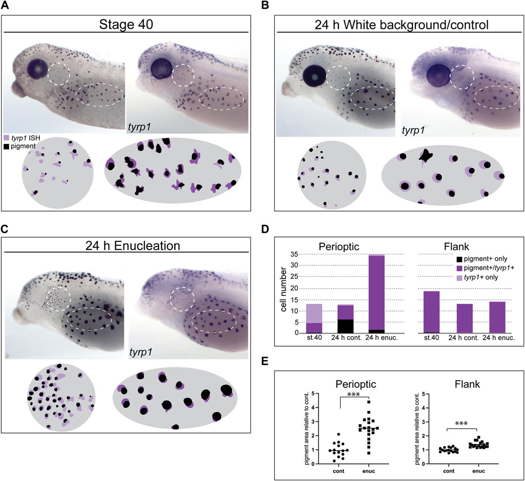 Figure 4. Loss of visual input increases tyrp1 expression and perioptic melanophore differentiation. (A–C) tyrp1 mRNA compared to pigmentation for each larva by overlaying WMISH and pigment aggregate images (illustrated in circle and oval schematics for perioptic and flank areas, respectively) at stage 40 (A), after 24 h on a white background (B), and 24 h post-enucleation (C). (D) Average number of pigmented + only, pigmented+/tyrp1+, and tyrp1+ only cells for each condition shown in A-C for the perioptic area and flank. White dashed circle (perioptic region) and oval (flank) indicate analysis regions. (Perioptic-st.40: