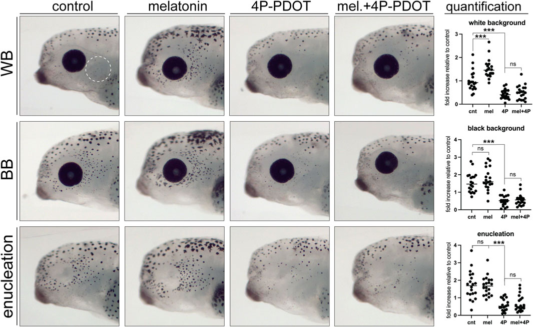 FIGURE 7. Melatonin signalling is necessary and sufficient to induce perioptic melanophore differentiation. Stage 40 larvae underwent sham surgery and were maintained in the light on a white background or black background, or were enucleated. Larvae from each condition were exposed to control, melatonin, melatonin receptor antagonist (4P-PDOT), or melatonin and 4P-PDOT solutions for a 24-h period. Melanophore numbers in the perioptic region (white dashed circle) were compared; White background: