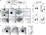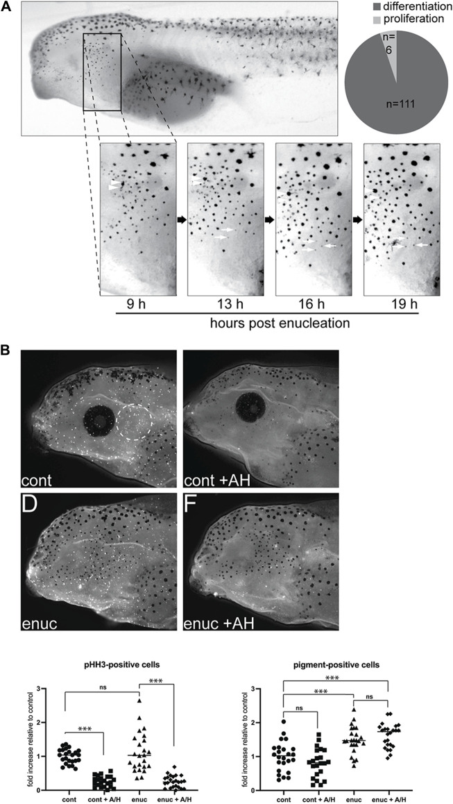 Figure 2. New pigmented cells emerge through de novo pigment production, not migration or proliferation. (A) To track the emergence of new melanophores, enucleated larvae were imaged from 9-19 h post-surgery. A common zone was identified across these images using anatomical landmarks so that individual cells could be tracked over time. Newly emerged pigment cells within the zone were identified (n = 117 melanophores, N = 6). The majority of these (n = 111) appeared de novo as a faint grey dot that darkened over time (white arrows). A few melanophores (n = 6) may have emerged from pigmented cell division (arrowheads). (B) Cell proliferation was inhibited in stage 40 control and enucleated larvae using aphidicolin-hydroxyurea (AH). The numbers of pHH3-positive and pigmented cells were assessed in the perioptic area (white dashed circle) in a blinded fashion after 24 h of AH on a white background. pHH3+ cells in the perioptic region were dramatically reduced in AH-treated larvae (pHH3-positive cells: