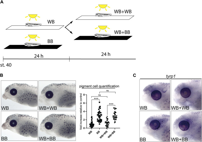FIGURE 5. Undifferentiated melanophores are maintained through larval stages. (A) Stage 40 larvae were exposed to different backgrounds while being illuminated from above for 24–48 h. (B) Larvae were maintain for 24 h on a white background (WB), for 48 h on a white background (WB + WB), for 24 h on a black background (BB), and for 24 h on a white background followed by 24 h on a black background (WB + BB). Perioptic melanophores were quantified (dashed circle in A;