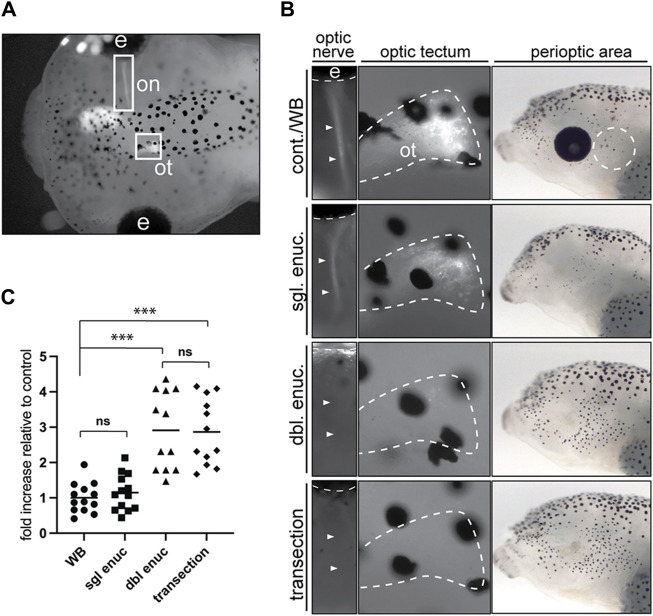 Figure 6. Optic nerve transection mimics the enucleation-induced increase in melanophore number. (A) Larvae with a unilaterally GFP-labeled optic nerve (on) and optic tectum (ot) underwent sham surgery (cont./WB), single enucleation (sgl. enuc.), double enucleation (dbl. enuc.), or single enucleation with transection of the remaining optic nerve (transection). (B) Images of representative larvae from each surgical condition. The first panel shows presence or absence of GFP-positive optic nerve (arrowheads), second panel shows the presence or absence of GFP-positive retinal ganglion cell axon terminals in the optic tectum (white dashed line), and third panel shows lateral brightfield view of perioptic region for each condition. (C) 24 h after enucleation and/or optic nerve transection or sham surgery, melanophore numbers in the perioptic region (white dashed circle in B, third panel) were compared;