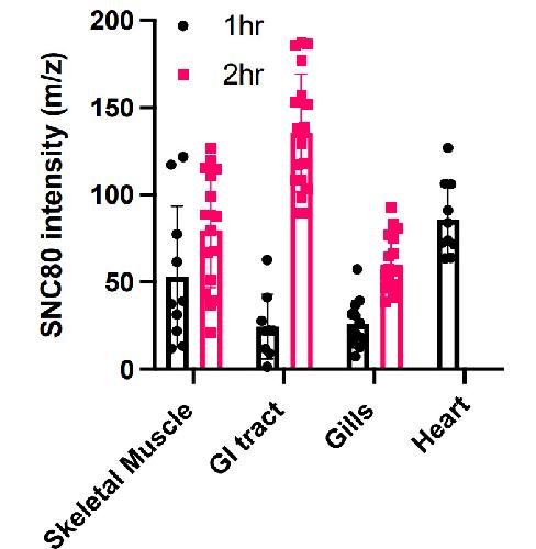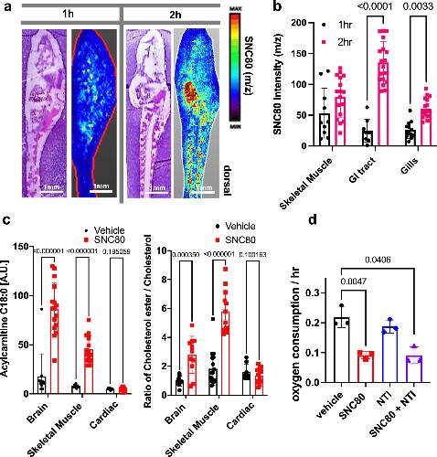 Figure 2. SNC80 uptake and activity at the delta opioid receptor.(a) Distribution of SNC80 in Xenopus tadpoles after 1 and 2 hr of compound exposure. (b) Uptake of SNC80 in the tadpole skeletal muscle, gastrointestinal (GI) tract, and gills at 1 and 2 hr of exposure. (c) Levels of acylcarnitine and cholesterol ester in the skeletal muscle, brain, and cardiac tissue after 1 hr of SNC80 treatment. In vivo distributions of SNC80 and lipid levels measured from N=5 tadpoles per condition; N=3 sections/slide. (d) Oxygen consumption in Xenopus tadpoles treated with SNC80, the delta opioid antagonist naltrindole, or a combination of SNC80 and naltrindole. N=3 replicates/group with each data point representing the cumulative oxygen consumption from 5 tadpoles. Statistical comparisons were performed using a two-way ANOVA (time × tissue region) with Sidak’s correction for multiple comparisons (b), multiple unpaired t-tests for each tissue region with FDR correction (c), and a Welch’s ANOVA test with Dunnett correction for multiple comparisons between vehicle and each treatment group (d). Bar plots show the mean ± SD of each group. |