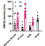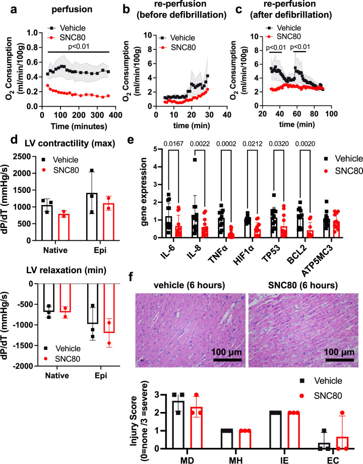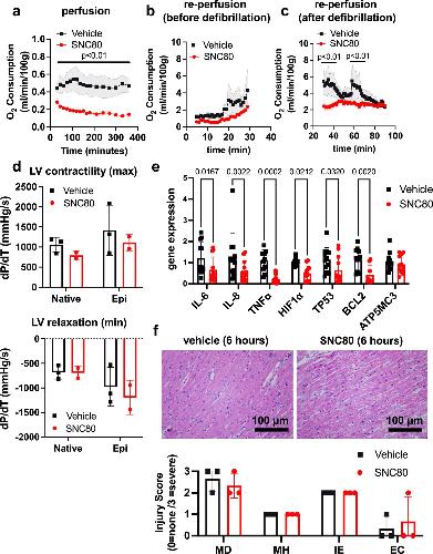 Figure 4. Preservation of porcine cardiac grafts with SNC80 over 6 hr.(a) Oxygen consumption for vehicle and SNC80-treated cardiac grafts perfused in the VP.S ENCORE device (n=3 hearts/group). (b) Oxygen consumption during cardiac reperfusion on the Langendorff system before defibrillation (n=3 vehicle and n=3 SNC80 hearts). (c) Oxygen consumption measured on the Langendorff system after defibrillation (n=3 vehicle and n=3 SNC80 hearts). (d) Left ventricle (LV) contractility and relaxation before and after defibrillation and tissue exposure to epinephrine (n=3 vehicle and n=2 SNC-treated hearts). (e) Gene expression analysis of heart biopsy samples for vehicle and SNC80-treated cardiac grafts (n=2 hearts/group; 3 technical replicates each). (f) Light microscopic views of hematoxylin and eosin (H&E)-stained histological sections of heart biopsies (×20 magnification) after 6 hr of perfusion and quantification of myocardial degeneration (MD), myocardial hemorrhage (MH), interstitial edema (IE), and endothelial changes (EC). Statistical comparisons were performed using multiple unpaired t-tests between SNC80 and vehicle-treated cardiac grafts (a,b,c), two-way ANOVA with Sidak’s correction for multiple comparisons between SNC80 and vehicle-treated cardiac grafts (d,f), and unpaired t-tests between SNC80 and vehicle for each gene of interest (e). Data represent the mean ± SD. |