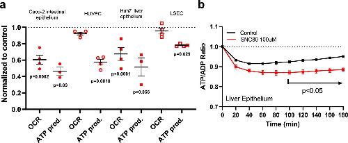 Figure 5—figure supplement 1 SNC80 treatment in cell culture and Organ Chip systems. (a) Oxygen consumption rate (OCR) and mitochondrial ATP production obtained with Seahorse measurements for Caco-2 intestinal epithelium (filled circle), human umbilical vein endothelial cell (HUVEC) (empty circles), Huh7 liver epithelium (filled squares), and liver sinusoidal endothelial cell (LSEC) (empty squares) after 2 hr 100 μM SNC80 treatment (n=3–4 biological replicates/cell type). Values are normalized to their respective vehicle controls. (b) Graph showing the quantitative drop in ATP/ADP ratio of Huh7 cells treated with 100 μM SNC80 (n=2 control and n=3 SNC80 biological replicates). Statistical comparisons were performed using a two-way ANOVA with Dunnett correction with multiple comparison control versus treatment for each dataset. Data represent the mean ± SD. |