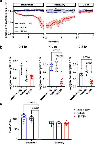 Figure 1. SNC80 treatment in Xenopus tadpoles.(a) Swimming activity of Xenopus during 100 μM SNC80 or vehicle treatment. Data represent the mean ± SD of n=3 replicates, with 10 tadpoles per replicate. (b) Oxygen consumption rate for Xenopus treated with SNC80 or vehicle controls. N=5 medium only, n=7 vehicle and n=9 SNC80, with each data point representing the cumulative oxygen consumption for 5 tadpoles. (c) Heart rate in SNC80 and vehicle-treated Xenopus (n=10 tadpoles/group). Statistical comparisons were performed using a Brown-Forsythe and Welch’s ANOVA test with a Dunnett correction for multiple comparisons (b) and a two-way ANOVA (treatment × timepoint) with Tukey correction for multiple comparisons (c). Bar plots show the mean ± SD of each group. |