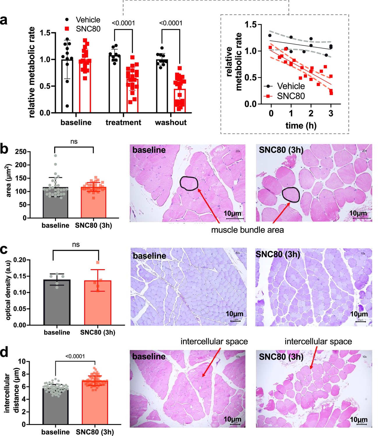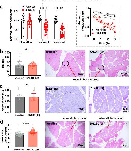 Figure 4—figure supplement 1. Preservation of whole porcine limbs with SNC80.(a) The relative metabolic rate at baseline is not statistically significantly different between control (n=3) and SNC80 (n=5) injected limbs. Metabolic rate is reduced during the treatment and washout phases for SNC80 relative to controls. (b) Mean muscle bundle area between T0 before SNC80 administration and at T3 after SNC80 administration and histographs of limb biopsy (×20 magnification) at T0 before SNC80 administration and T3 after SNC80 administration. Muscle bundle area is not affected by the administration of SNC80. (c) Optical density between T0 before SNC80 administration and at T3 after SNC80 administration and histographs of limb biopsy (×20 magnification) at T0 before SNC80 administration and T3 after SNC80 administration. Optical density is not affected by the administration of SNC80. (d) Mean intracellular distance during T0 before SNC80 administration versus T3 after SNC80 administration and histographs of limb biopsy (×10 magnification) at T0 before SNC80 administration and T3 after SNC80 administration. Red arrows indicate intracellular distance measured. Intracellular distance increases after the administration of SNC80. Statistical comparisons were performed using a mixed-effects analysis with a Sidak’s test for multiple comparisons (a) and Welch’s t-test (b–d). Data represent the mean ± SD. |
