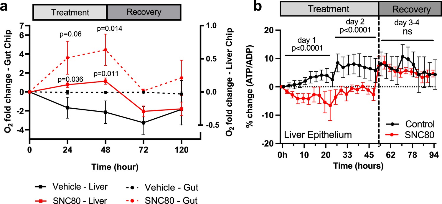 Figure 5. SNC80 treatment in human Organ Chips.(a) Monitoring changes in O2 levels in human Gut (dotted lines; n=6 Chips/group) or Liver (straight lines; n=15–16 Chips/group) Chips throughout the treatment with 100 µM SNC80 (0–48 hr) and recovery (48–120 hr) versus vehicle control chip. (b) Graph showing the quantitative drop in ATP/ADP ratio of Liver Chip treated for 48 hr with 100 μM SNC80 or vehicle control as well as 2 days recovery after drug washout (n=5 control and n=3 SNC80 Chips). Statistical comparisons were performed using multiple unpaired t-tests for each timestamp with multiple comparison between control and treated cells. Data represent the mean ± SD. |