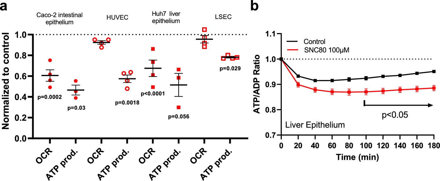 Figure 5—figure supplement 1. SNC80 treatment in cell culture and Organ Chip systems.(a) Oxygen consumption rate (OCR) and mitochondrial ATP production obtained with Seahorse measurements for Caco-2 intestinal epithelium (filled circle), human umbilical vein endothelial cell (HUVEC) (empty circles), Huh7 liver epithelium (filled squares), and liver sinusoidal endothelial cell (LSEC) (empty squares) after 2 hr 100 μM SNC80 treatment (n=3–4 biological replicates/cell type). Values are normalized to their respective vehicle controls. (b) Graph showing the quantitative drop in ATP/ADP ratio of Huh7 cells treated with 100 μM SNC80 (n=2 control and n=3 SNC80 biological replicates). Statistical comparisons were performed using a two-way ANOVA with Dunnett correction with multiple comparison control versus treatment for each dataset. Data represent the mean ± SD. |