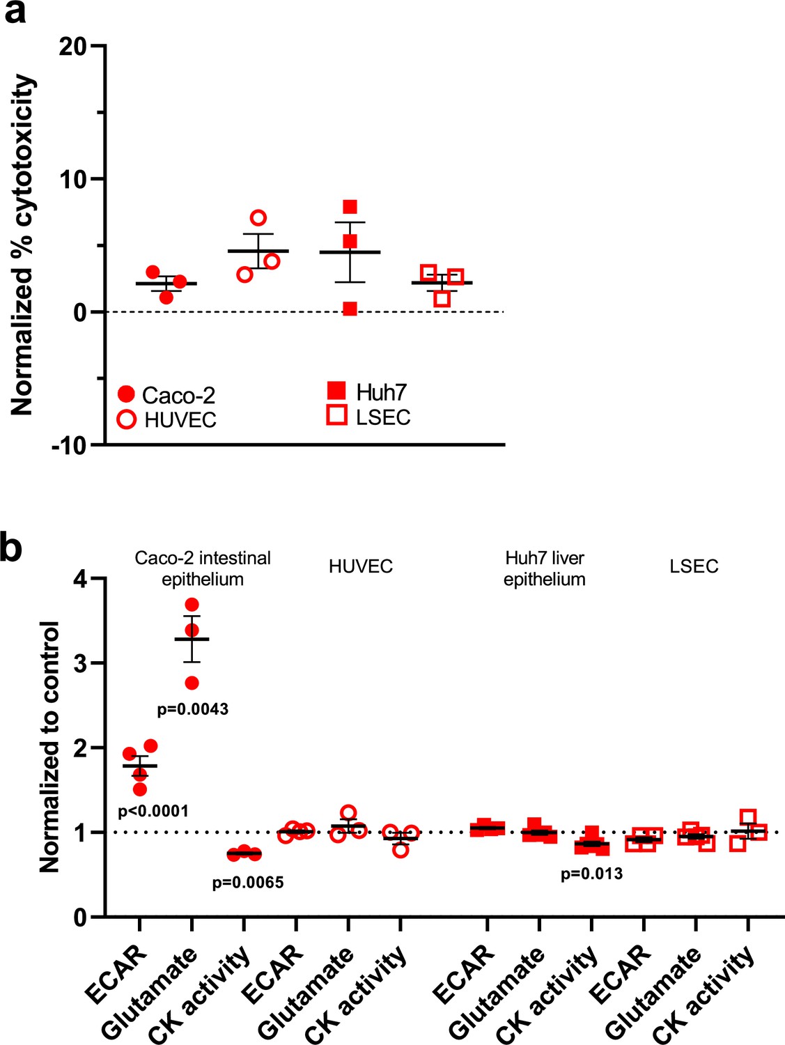 Figure 5—figure supplement 2 Metabolic measurements in gut and liver cultures treated with SNC80. (a) Normalized percent cytotoxicity for Caco-2 intestinal epithelial cells (filled circles) or human umbilical vein endothelial cells (HUVECs) (empty circles) as well as Huh7 liver epithelium (filled squares) or liver sinusoidal endothelial cells (LSECs) (empty squares) after 2 hr of exposure to 100 μM SNC80 (n=3 biological replicates/cell type). (b) Normalized extracellular acidification rate (ECAR), glutamate, and creatine kinase (CK) activity for Caco-2 intestinal epithelial cells (filled circles) and HUVECs (empty circles) as well as Huh7 liver epithelium (filled squares) and LSECs (empty squares) (n=3–6 biological replicates/measurement/cell type). Statistical comparisons were performed using a two-way ANOVA with Dunnett correction with multiple comparison control versus treatment for each dataset (a,b). Data represent the mean ± SD. |