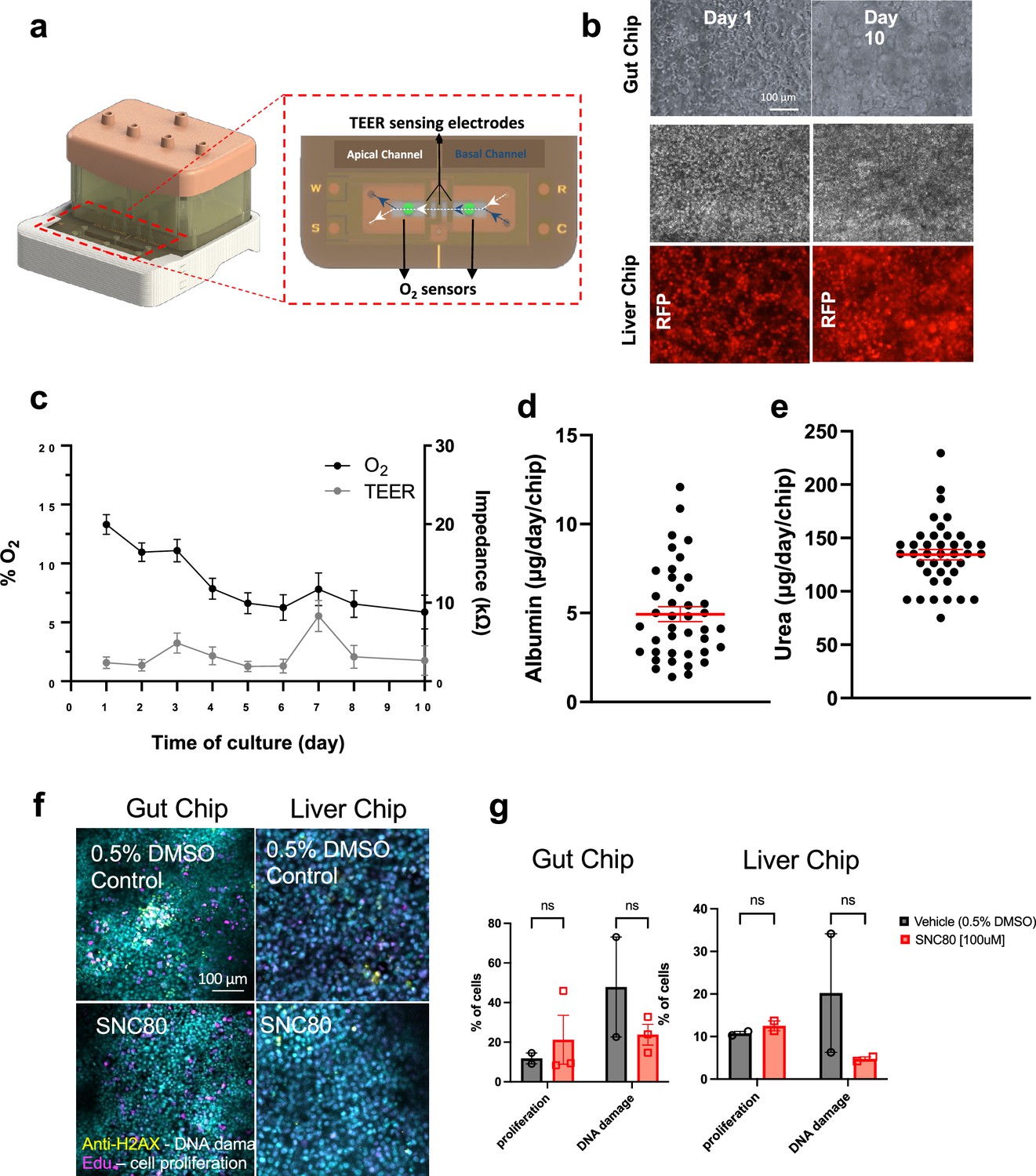 Figure 5—figure supplement 3. Characterization of human Gut and Liver Chips with integrated sensing technology.(a) Illustration of the sensor-integrated OOC unit connected to reservoir pod for automatic operation of fluid flow using pneumatic pressure (left). Inset shows a schematic of the top and bottom views of the sensor-chip-PCB compartment showing locations of transepithelial electrical resistance (TEER) electrodes and O2 sensors in the apical and basal channels. Four O2 sensing spots were added to the channels – two in the top and two in the bottom channels for across the chip measurement. Electrode connectors are necessary for remote TEER sensing. (b) Phase contrast images of Caco-2 cells seeded on sensor chip at days 1 and 10 of culture (top) and Huh7 cells seeded on sensor chip at days 1 and 10 (middle). Fluorescent images of Liver Chip at days 1 and 10 of the transduced nuclear marker (bottom). (c) Percentage of O2 level (black; n=16 Chips) and TEER impedance values (gray; n=9 Chips) on sensor Liver Chip during 10 days of culture. (d) Average albumin production of Liver Chips at day of experiment starts (days 7–10 of culture; n=40 Chips). (e) Average urea production of Liver Chips at day of experiment starts (days 7–10 of culture; n=40 Chips). (f) Representative immunofluorescence images of the sensor Gut Chip (left) and Liver Chip (right) epithelium stained with DNA damage marker (H2AX) and nuclei (DAPI) for vehicle control and SNC80-treated tissues after 7 days’ recovery. (g) Quantitative analysis of proliferation and DNA damage stains on Gut and Liver Chips after 48 hr of treatment and 7-day recovery to 100 μM SNC80 (2–3 biological replicates/group/marker; each data point corresponds to an average of multiple fields of view). Statistical comparisons were performed using multiple unpaired t-tests for each marker with FDR correction. Data represent the mean ± SD. |