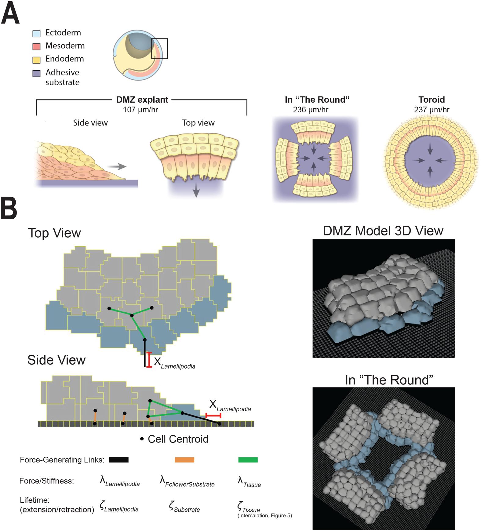 Fig. 1.Modeling Xenopus mesendoderm tissue. (A) Illustration of gastrula-stage embryos and explants. Hemisected embryo at top, box indicates approximate location of dorsal marginal zone (DMZ) tissue explant dissected from the embryo and placed on an adhesive substrate; side and top views of adherent explant illustrate cellular organization of mesendoderm. Four separate DMZ explants are arranged as shown to generate the ‘in-the-round’ (ITR) geometry. The ITR approximates a single toroid or donut explant comprised of the entire mesendodermal mantle. Arrows indicate the direction of travel of the leading row cells in each preparation. Migration speeds taken from Davidson et al., 2002 are shown for each explant configuration. (B) Representative DMZ computational model images and schematic of critical parameters are shown. See Materials and Methods for the exhaustive parameter table and description of all parameters. Additional figures illustrating Xenopus laevis gastrulation and explant preparation procedures can be found in Davidson et al., 2002 and Sonavane et al., 2017. |