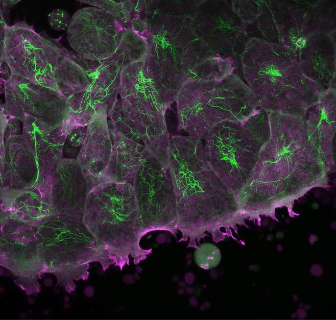 Movie 1.Timelapse movie of single DMZ explant on fibronectin. Actin (magenta) and Keratin (green) were labeled by injection of mRNA transcript encoding LifeAct-RFP (actin) and XCK-GFP (cytokeratin filaments). Confocal Z-stacks were collected at 2 min intervals (15 frames). |