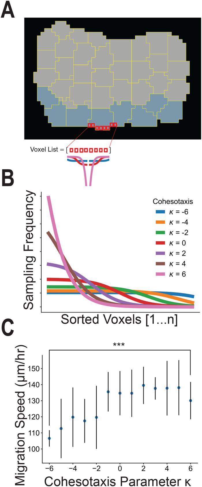 Fig. 3.Cohesotaxis increases the speed of migration. Cohesotaxis representation as a directional migratory bias for convex cells. (A) Preferential selection of voxels to establish a persistent direction of migration is described. (B) Probability of selecting from the sorted list of free voxels to produce the bias described in panel A and derived in Materials and Methods. (C) Measure of migration speed for different values of cohesotaxis parameter κ applied (n=10 per κ value, ***denotes significance at P<0.001 by independent samples t-test). |