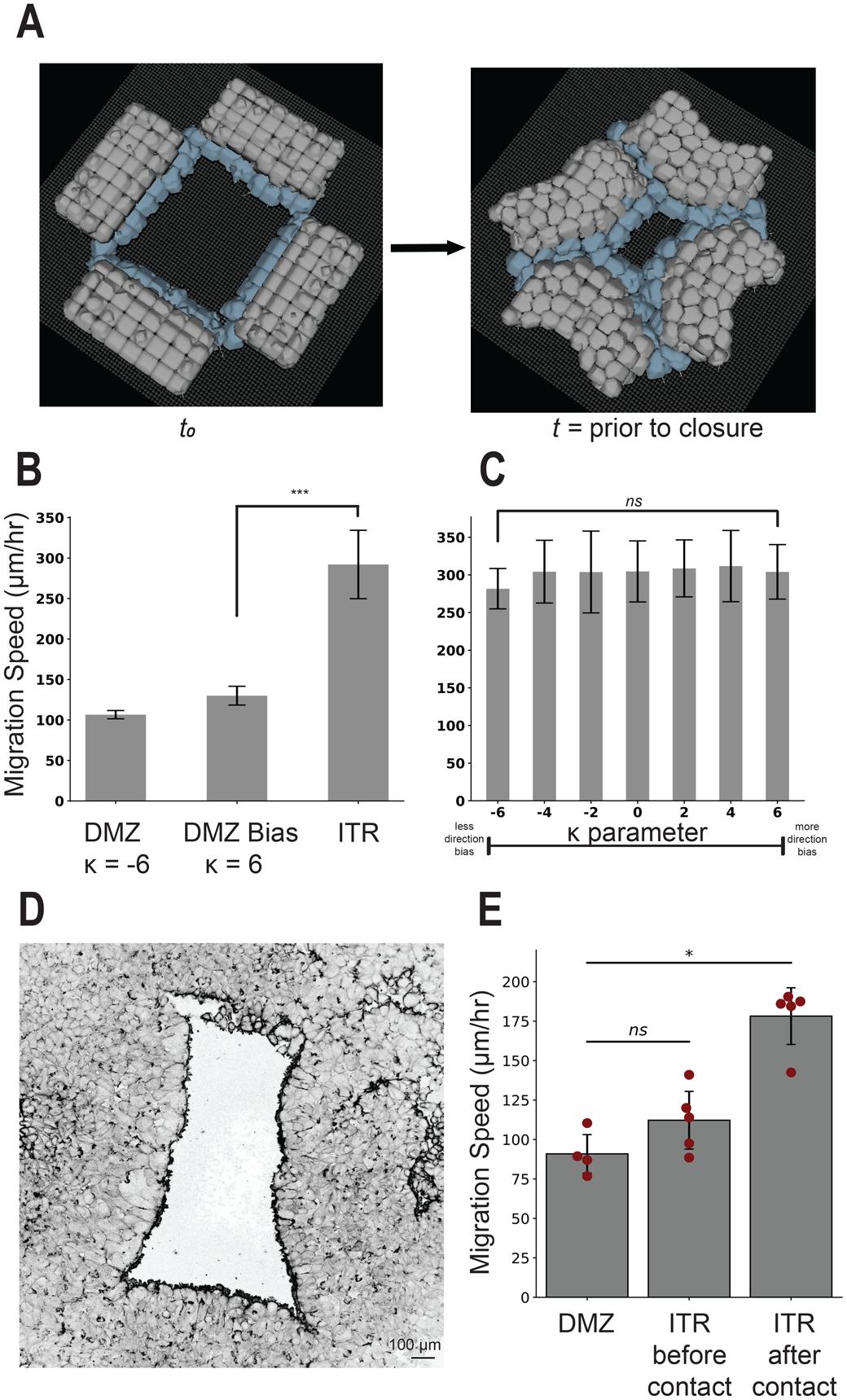 Fig. 4.‘In-the-round’ geometry increases migration speed of the DMZ explant. ITR experiment configuration. (A) Representative images displaying model initialization at t0 and time to closure. (B) Migration speed comparison with the DMZ explant with and without bias (K=−6,6), *** indicates P<0.001 by independent samples t-test. (C) Effects of modulating the cohesotaxis parameter upon tissue migration speed in the ITR configuration, ns indicates P>0.05 by one-way ANOVA. Simulations results in panels B and C include n=10, mean±s.d. (D) Representative image from a biological ITR experiment, before time to closure. (E) Experiments comparing migration speed of a single linear DMZ explant and the explants in an ITR configuration before and after collision as performed in Davidson et al., 2002, n=4, mean±s.d., significance at P<0.05 by independent samples t-test. |