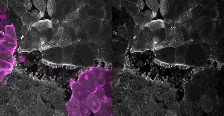 Movie 5.Interface between two DMZs in vitro (left) and in silico (right) migrating from 4 DMZs placed ITR. Left: Actin (greyscale) was labeled by injection of mRNA encoding LifeAct-RFP. Two of the four DMZs were labeled with Alexa 488 dextran (magenta-left panel) to identify individual DMZs. Confocal Z-stacks were collected at 3 min intervals (11 frames). Representative frames from a ITR simulation are shown on the right. |