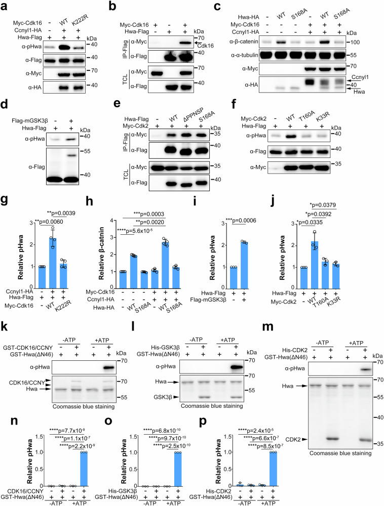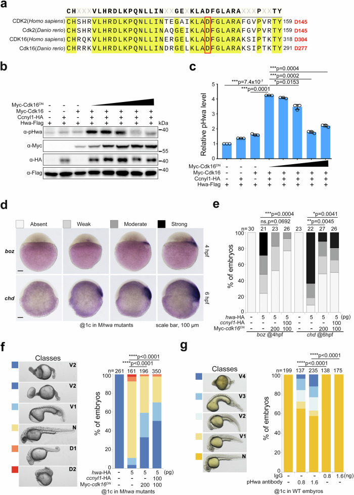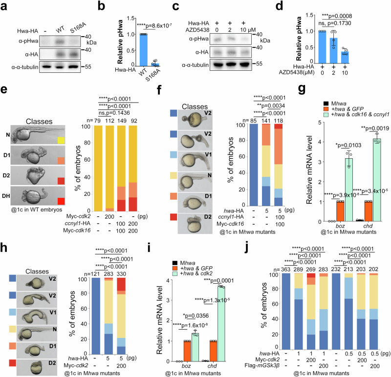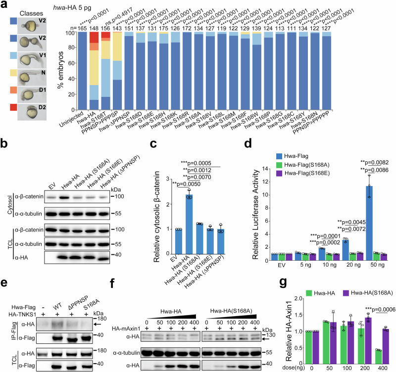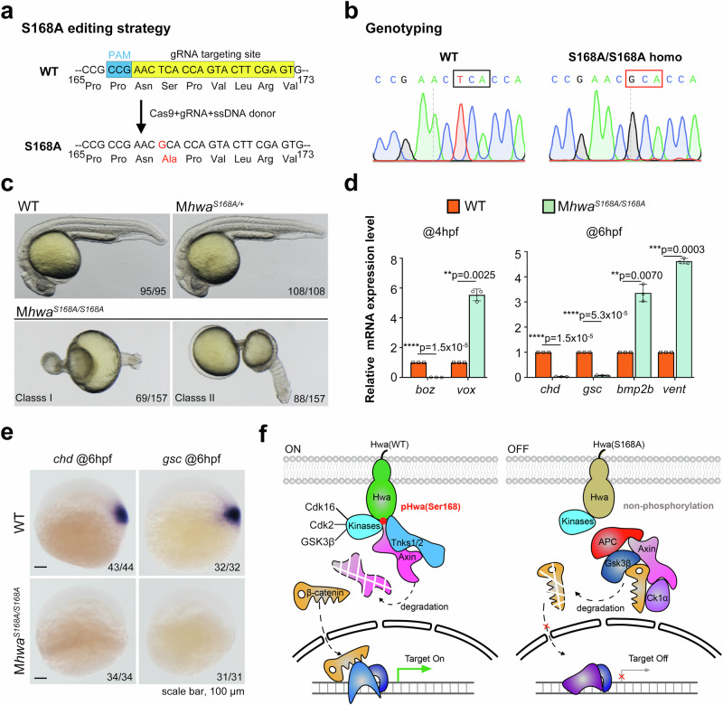 Embryonic axis formation is essential for patterning and morphogenesis in vertebrates and is tightly regulated by the dorsal organizer. Previously, we demonstrated that maternally derived Huluwa (Hwa) acts as a dorsal determinant, dictating axis formation by activating β-catenin signaling in zebrafish and Xenopus. However, the mechanism of activation and fine regulation of the Hwa protein remains unclear. Through candidate screening we identified a mutation at Ser168 in the PPNSP motif of Hwa that dramatically abolishes its axis-inducing activity. Mechanistically, mutating the Ser168 residue reduced its binding affinity to Tankyrase 1/2 and the degradation of the Axin protein, weakening β-catenin signaling activation. We confirmed that Ser168 is phosphorylated and that phosphorylation increases Hwa activity in β-catenin signaling and axis induction. Several kinases including Cdk16, Cdk2, and GSK3β, were found to enhance Ser168 phosphorylation in vitro and in vivo. Both dominant-negative Cdk16 expression and pHwa (Ser168) antibody treatment reduce Hwa function. Lastly, a knock-in allele mutating Ser168 to alanine resulted in embryos lacking body axes, demonstrating that Ser168 is essential to axis formation. In summary, Ser168 acts as a phosphorylation switch in Hwa/β-catenin signaling for embryonic axis induction, regulated by multiple kinases.