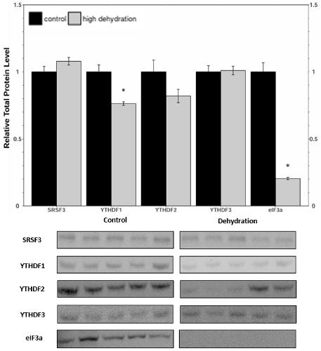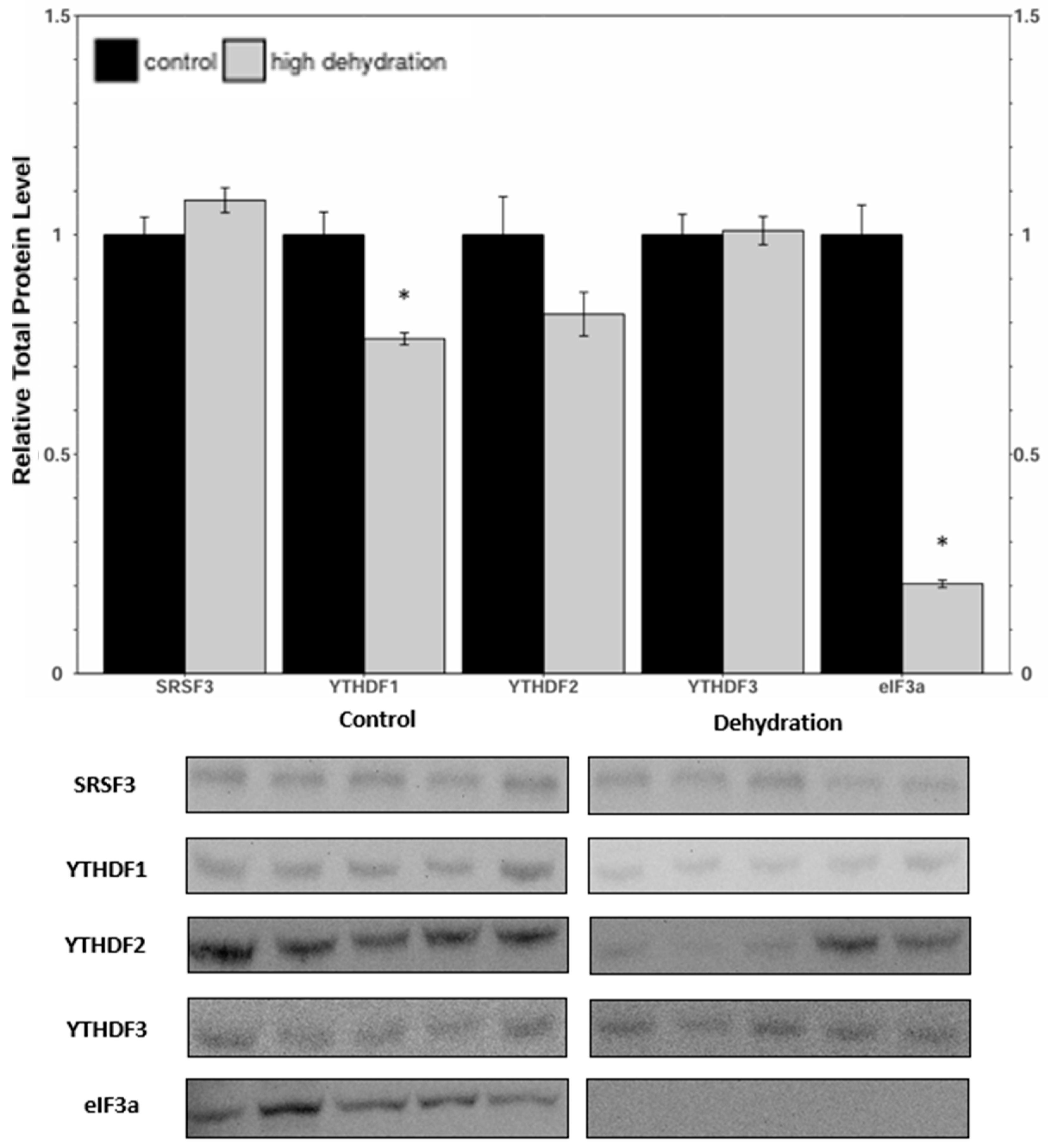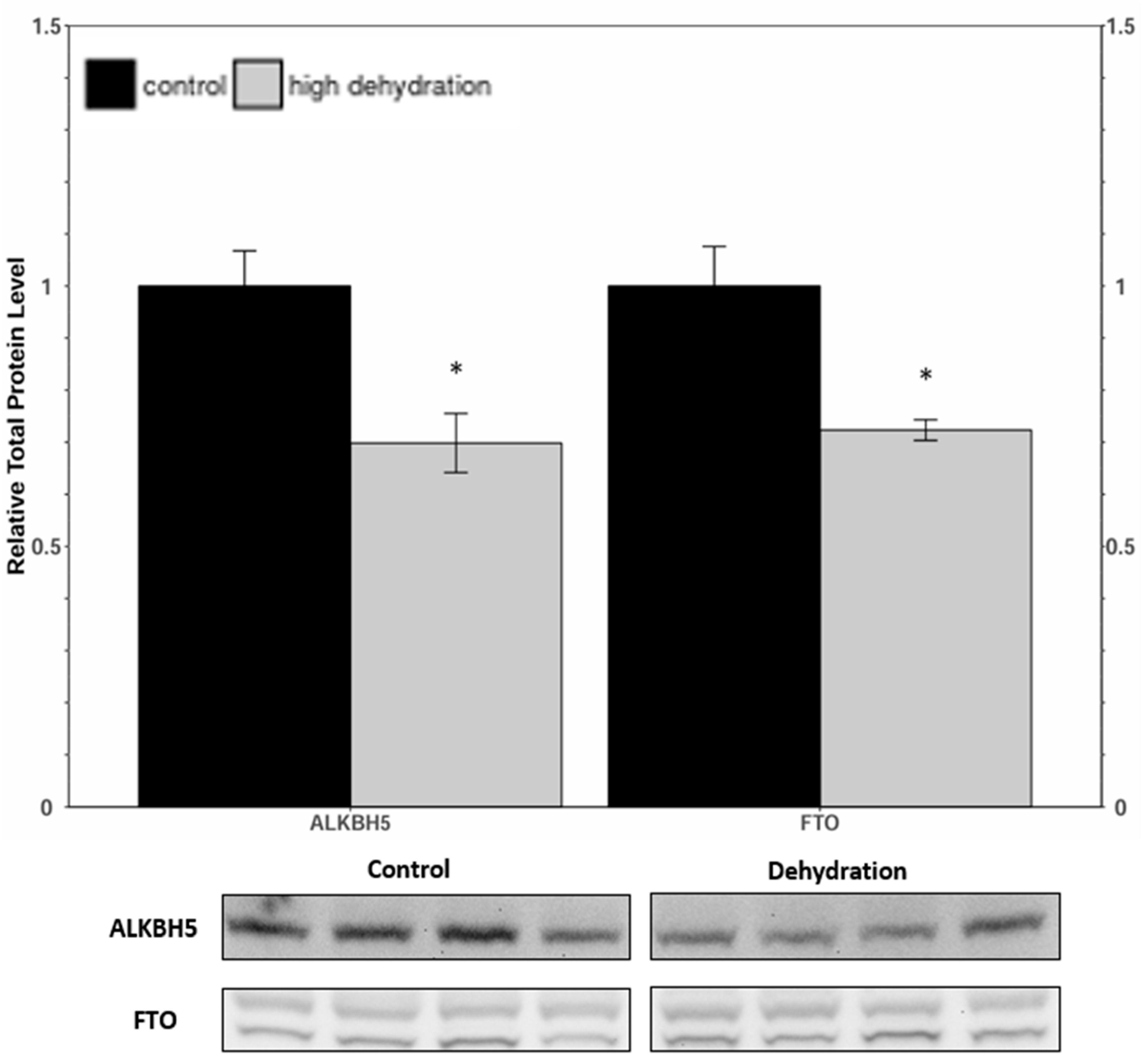 The African clawed frog, Xenopus laevis, exhibits remarkable adaptations to survive in its arid habitat, including behavioral and metabolic changes during periods of drought. During extreme dehydration, X. laevis undergoes estivation, a state characterized by increased urea and ammonia levels, depression of the metabolic rate, and tissue hypoxia. To understand the molecular mechanisms underlying these adaptations, we investigated the potential role of N6-methyladenosine (m6A), a widespread mRNA modification, in X. laevis during extreme dehydration. We analyzed the protein levels of key components in the m6A pathway, including writers (METTL3, METTL14, and WTAP), erasers (ALKBH5 and FTO), and readers (SRSF3, YTHDF1, YTHDF2, YTHDF3, and eIF3a), in the liver and kidneys of control frogs and frogs that had lost 35 ± 0.93% of their total body water. The relative protein levels generally decreased or remained unchanged, with the exception of YTHDF3, which depicted a protein level increase in the liver. Notable changes included eIF3a, which was downregulated by 26 ± 8% and 80 ± 8% in the dehydrated liver and kidney tissues, respectively. Additionally, the total m6A increased by 353 ± 30% and 177 ± 17% in dehydrated liver and kidney RNA samples, respectively. This study highlights the importance of epigenetic mechanisms in stress tolerance and provides a foundation for further exploration of the role of epigenetics in dehydration tolerance.