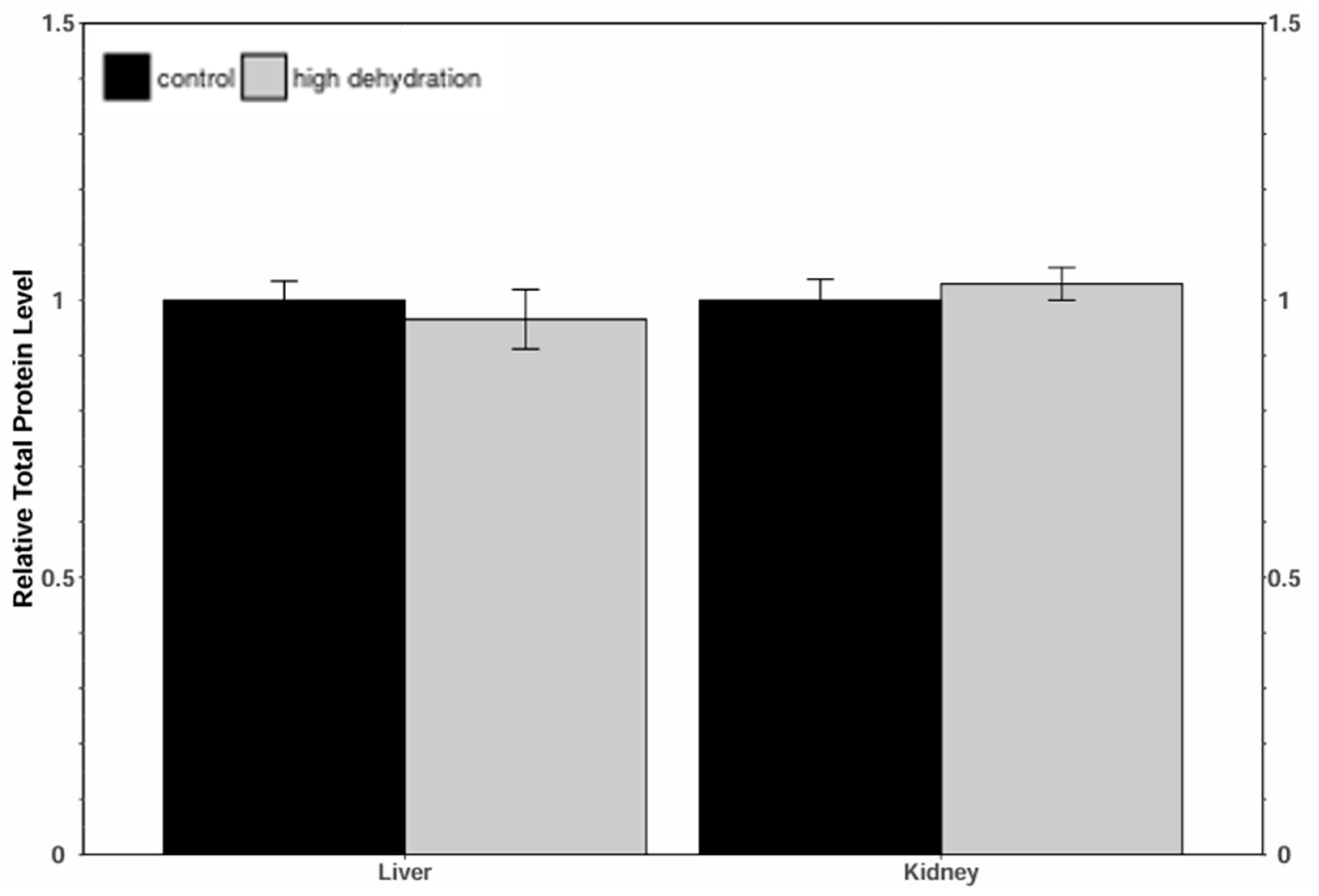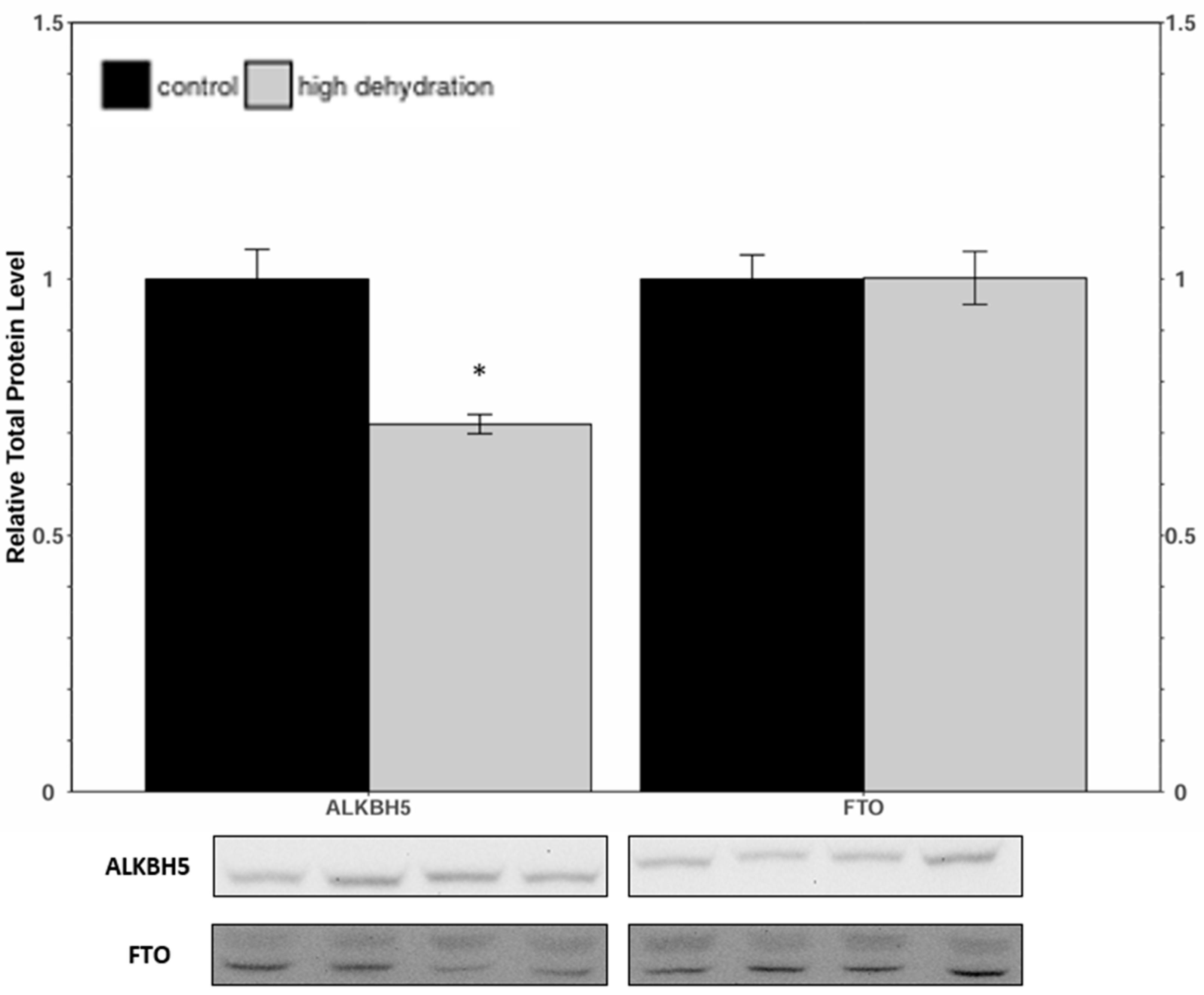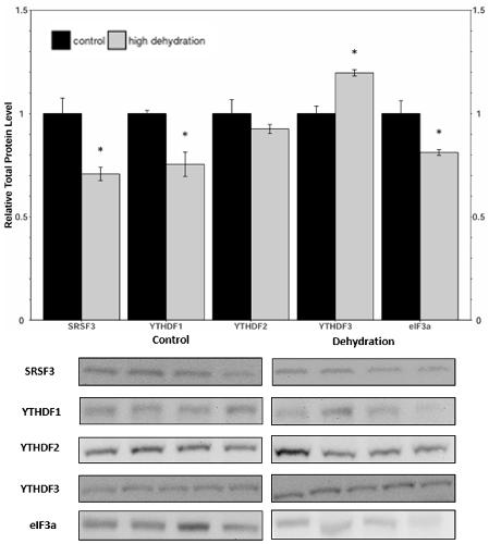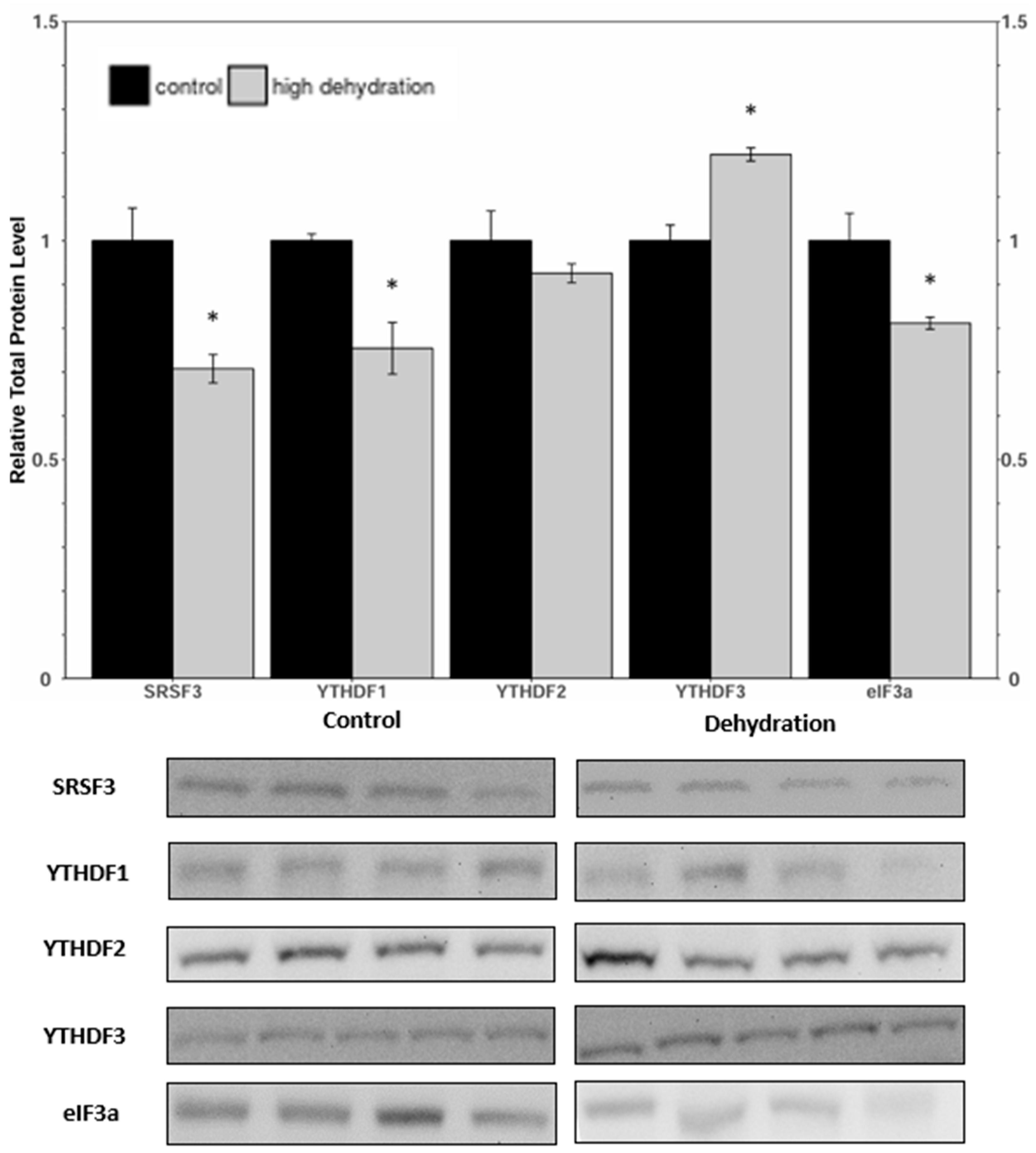 The African clawed frog, Xenopus laevis, exhibits remarkable adaptations to survive in its arid habitat, including behavioral and metabolic changes during periods of drought. During extreme dehydration, X. laevis undergoes estivation, a state characterized by increased urea and ammonia levels, depression of the metabolic rate, and tissue hypoxia. To understand the molecular mechanisms underlying these adaptations, we investigated the potential role of N6-methyladenosine (m6A), a widespread mRNA modification, in X. laevis during extreme dehydration. We analyzed the protein levels of key components in the m6A pathway, including writers (METTL3, METTL14, and WTAP), erasers (ALKBH5 and FTO), and readers (SRSF3, YTHDF1, YTHDF2, YTHDF3, and eIF3a), in the liver and kidneys of control frogs and frogs that had lost 35 ± 0.93% of their total body water. The relative protein levels generally decreased or remained unchanged, with the exception of YTHDF3, which depicted a protein level increase in the liver. Notable changes included eIF3a, which was downregulated by 26 ± 8% and 80 ± 8% in the dehydrated liver and kidney tissues, respectively. Additionally, the total m6A increased by 353 ± 30% and 177 ± 17% in dehydrated liver and kidney RNA samples, respectively. This study highlights the importance of epigenetic mechanisms in stress tolerance and provides a foundation for further exploration of the role of epigenetics in dehydration tolerance.