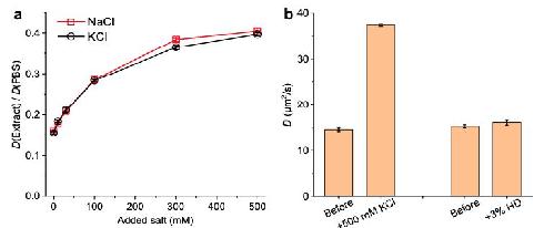 Figure S3. Diffusion of Cy3B-labeled HEWL in extracts supplemented with NaCl, KCl, and 1,6-hexanediol. (a) SMdM-determined relative in-extract D values of Cy3B-labeled HEWL normalized to in-PBS values, for two samples separately added with NaCl (red) and KCl (black) to different concentrations. Error bars: Sample standard deviations between results from three SMdM measurements at each data point. (b) SMdM-determined D values of Cy3B-labeled HEWL in two extract samples, before and after separately adding 500 mM KCl or 3% 1,6-hexanediol. Error bars: Sample standard deviations between results from three SMdM measurements.